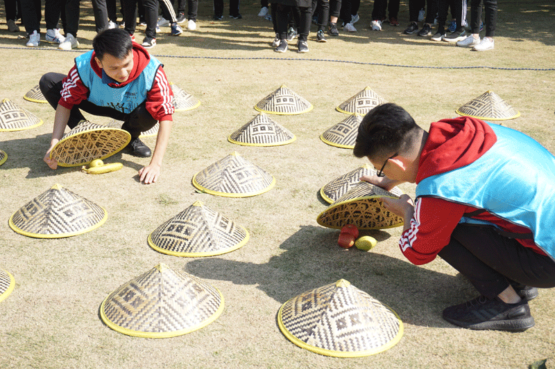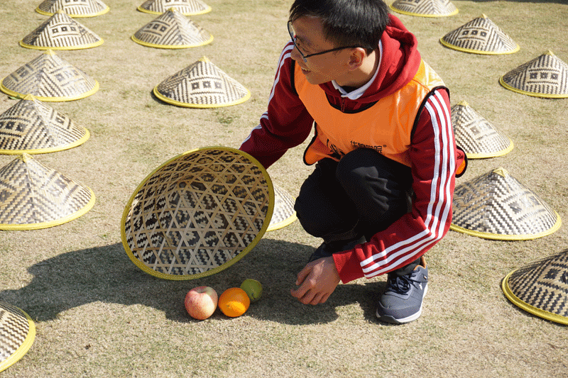 第三项活动是水果连连看。放置外形相同的草帽在场地划定范围内,每个帽子下面都有一种水果。每个小队轮流派人进入放置草帽的场地竞猜。只有两个草帽下的水果相同,才可以将水果带走。这是对观察力、记忆力和沟通力的考察,难度可想而知。但是老师们个个机智聪明,他们在仔细观察与思考下,没用多长时间就将教练们精心准备的水果收入囊中。