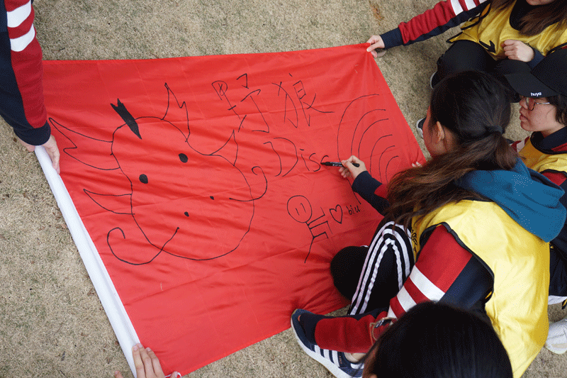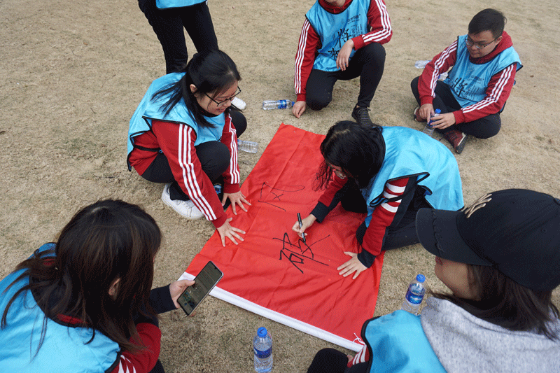 第一项活动是分队。在教练的指挥下,老师们被随机分为4队,并要求每队在15分钟内完成队名、队旗和队形的设计。活动一开始,大家各尽所能,画画、想口号、摆队型。最后,“破风”、“胖五”、“火机”和“野狼disco”四个别具特色的队名便应运而生。