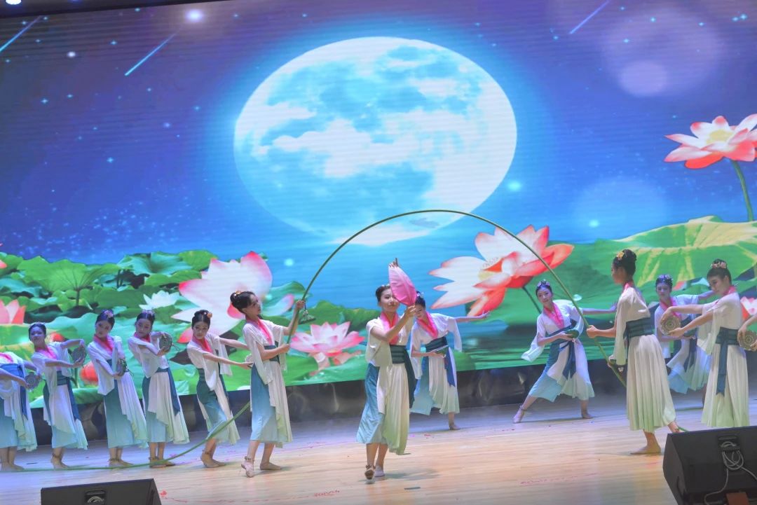江南水乡、花鼓声声,一群采莲的仙女在嬉戏欢唱中向我们走来。“花鼓”敲击出了江南水乡的采莲美景,“脚铃”伴随着古典舞姿勾画出美好生活的画面。