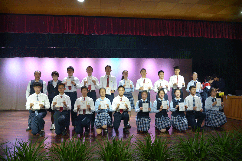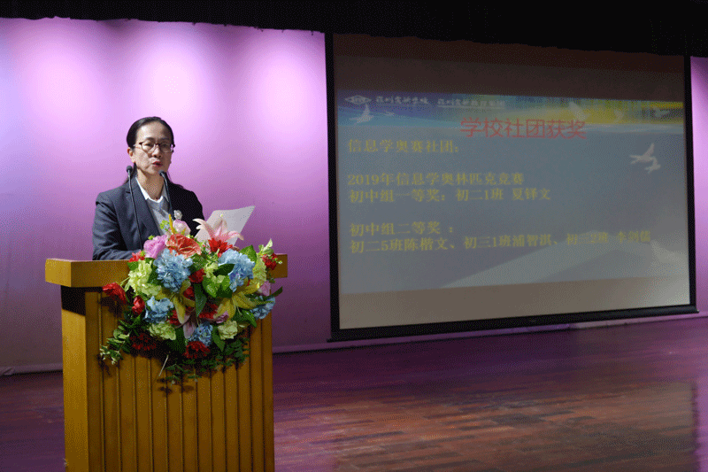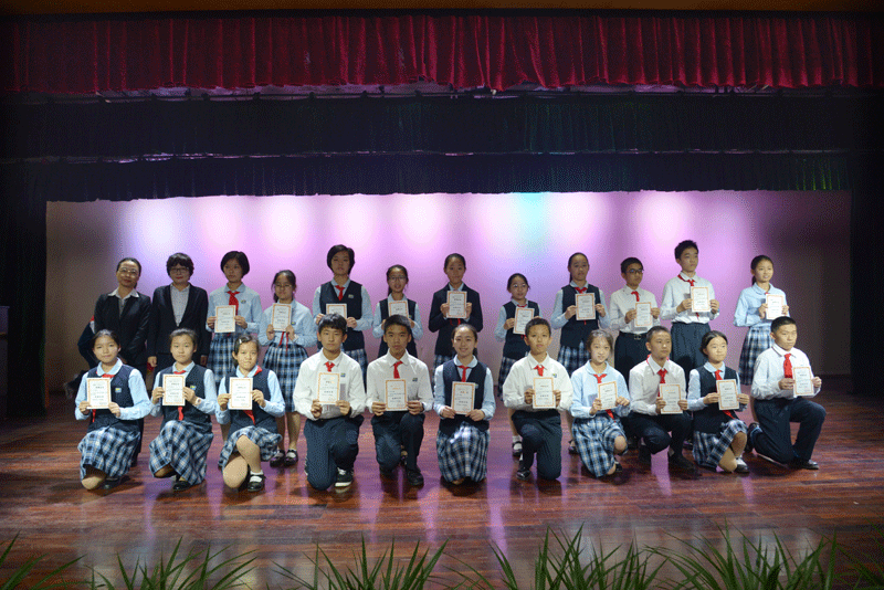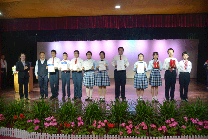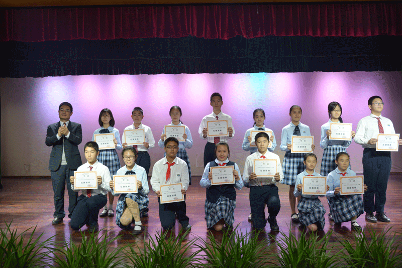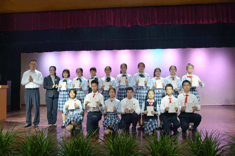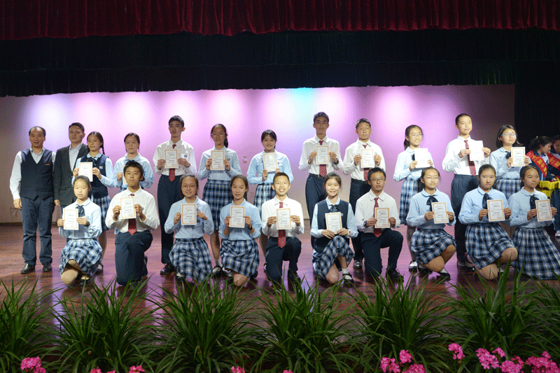 本学期,同学们不仅在各项活动中大放异彩,而且在日复一日的学习中更是积极上进,认真努力,在学业上取得了可喜的进步。教务处王洪吉主任宣读了本学期获得“学业优秀奖”的学生名单以及航模机器人社团和信息学奥赛社团学生获奖名单。教务处王洪吉主任、胡晓江主任,办公室潘惠群主任,总务处石占虎主任先后为获奖学生和代表颁奖。学生处张楠主任宣读了本学期学生处表彰决定,其中包括了获得三好学生、优秀干部等各项名单,以及足球队、合唱队、管乐队和美术社团参加各项比赛的获奖情况。学生处张楠主任和徐枫主任为获奖同学及代表颁奖。最后,邓旭校长为荣获红旗班集体的各班代表颁奖。