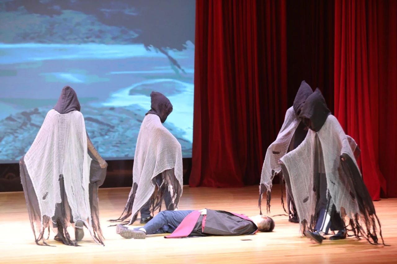 初二(1)、(5)班同学倾情演绎的《哈利·波特与魔法石》拉开了演出的帷幕。罗恩一家穿越九又四分之三站台,开启魔法世界之旅;火车上罗恩、哈利、赫敏初遇,铁三角友谊之花悄然绽放;霍格沃滋新生分院仪式庄重神秘,各展风采;魔法课与魔药课趣事连连,令人捧腹。剧情结构紧凑,演员激情澎湃,舞台效果力量与艺术尽显,让观众仿佛置身于真正的魔法世界,收获沉浸式的剧场体验。