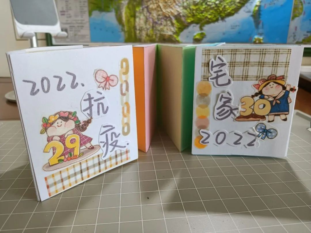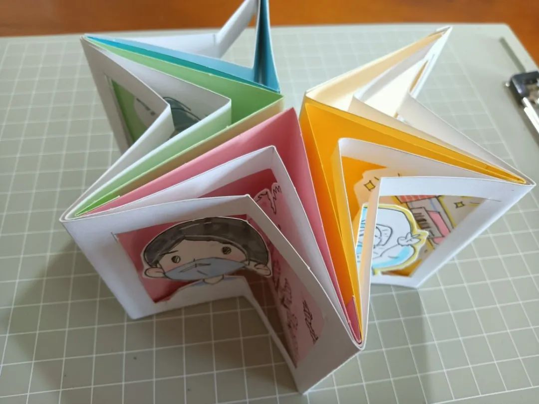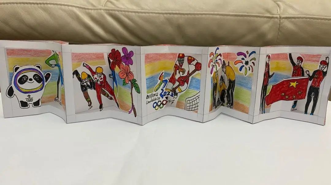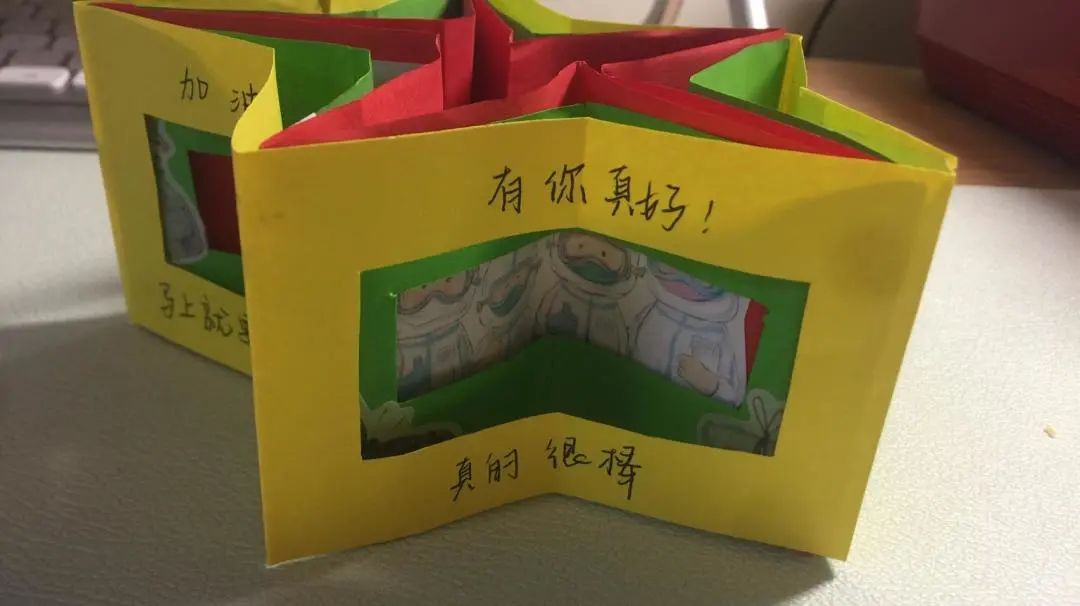 同学们在居家学习时,许许多多的人们为动态清零、恢复线下生产而奋战。他们有每日监测核酸的白衣天使,有挨家挨户上门登记的志愿工作者,也有披星戴月、不辞劳苦为我们带来生活便利的快递外卖小哥们。为致敬这些“抗疫战士”,同学们用画笔,用剪刀制作星型立体书,表达自己的感激之情。部分同学还以奥运为主题制作立体书,向奥运健儿致敬。
