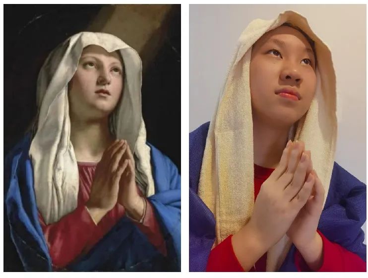 欣赏经典名画可以有多种方式。初二年级的同学们在线上课程中,了解古今中外的美术作品,学习如何欣赏世界名家名画,创造性地模仿名家名画的服饰、动作、表情、道具、背景、色彩和拍摄角度,用创意致敬经典,展现细致的观察力和艺术感受力,表达对名画名作的理解,在活动中体验,在体验中感悟,形成良好的美术鉴赏能力,提升美术综合素养。
