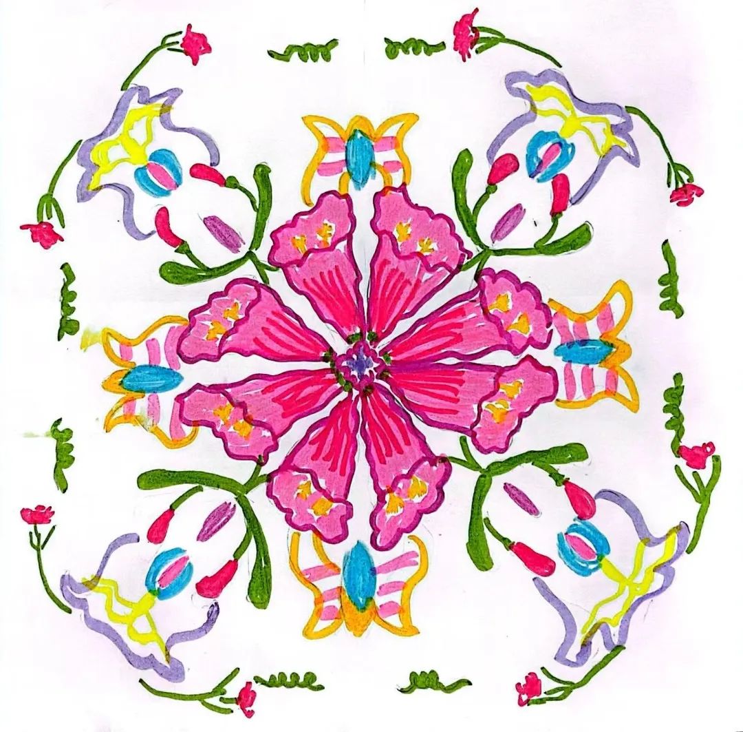 花卉纹样取材于大自然中千姿百态的花草。当我们走进百花丛中,便很容易获取图案创作的素材与灵感,因为自然与生活是图案设计的源泉。初一年级的同学们以大自然的花卉为设计元素,创作了一批优秀作品。从花卉的写生到纹样的变形与装饰,从单独纹样的形式到连续纹样的组合变化,应有尽有。他们不仅绘出明艳生动的花卉纹样,还用纹样点亮生活之美。