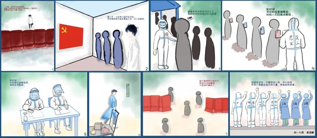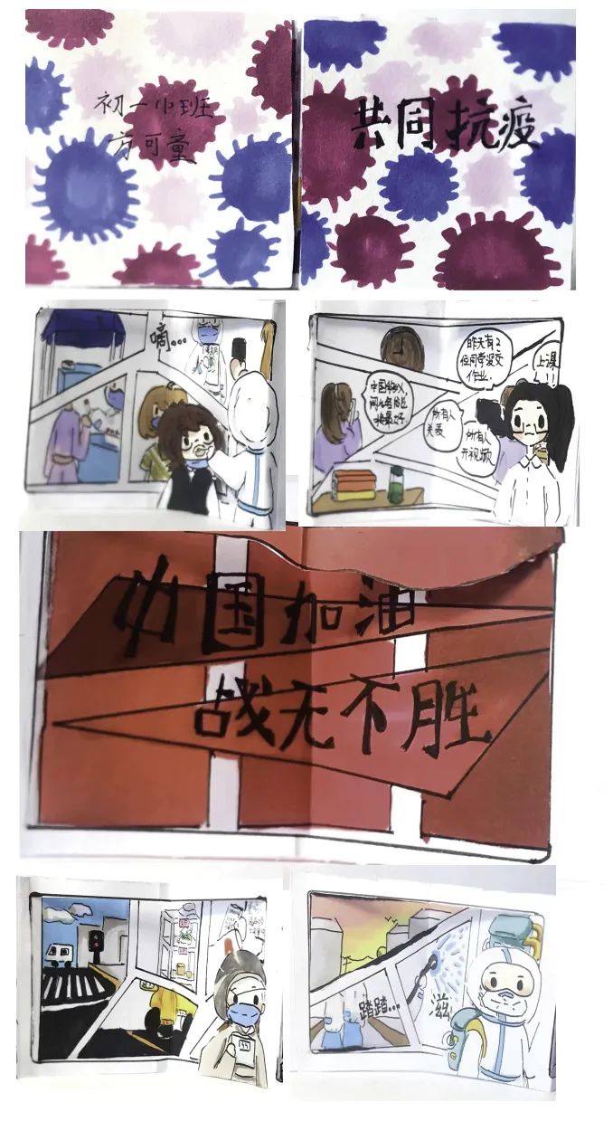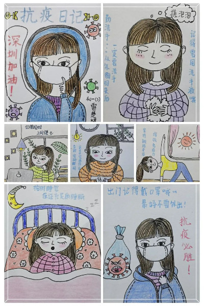 在今年深圳疫情防控形势复杂严峻之时,初一年级的同学们用绘本创作的形式记录了居家防控、宅家网课的学习与生活,并向奋战抗疫一线的工作人员加油致敬!