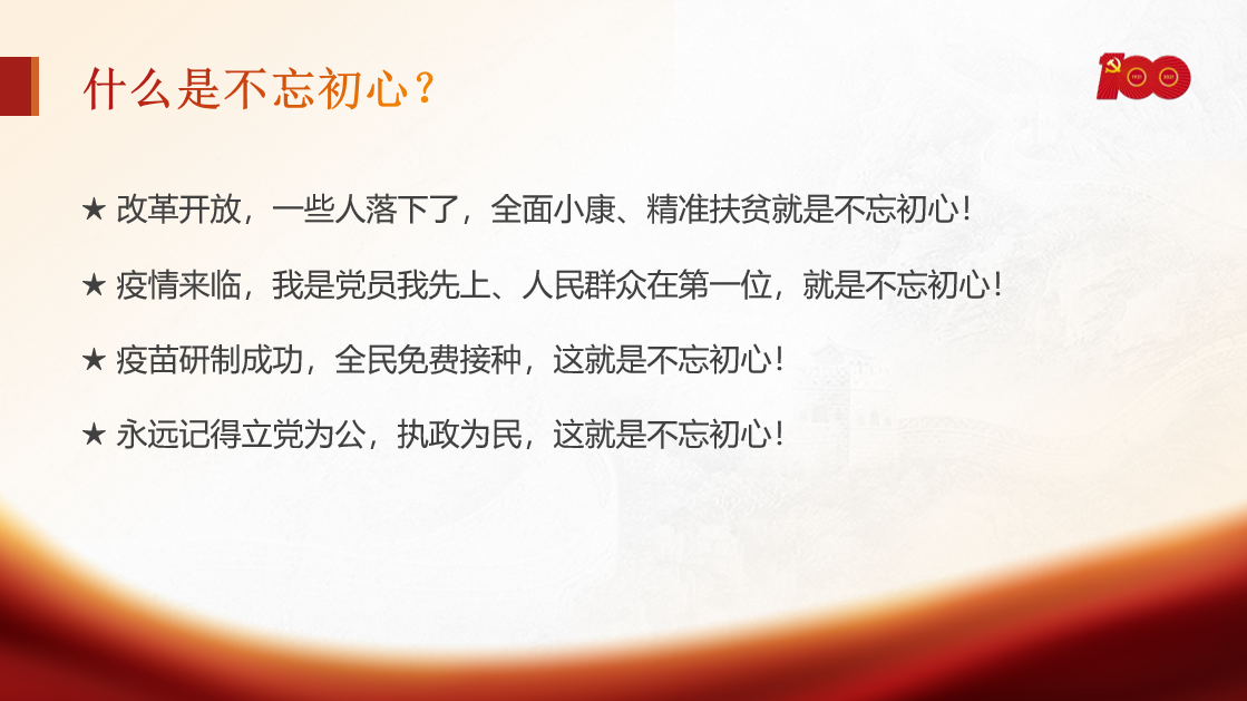 上周四,在班主任吴惠娟老师的指导下,全班同学进行了以“庆祝中国共产党百年华诞”为主题的爱国主义班会课学习。在此次班会课中,我们了解到党在不同历史阶段面临的不同历史任务,以及党在工作中始终不变的初心和使命——为中国人民谋利益、为中华民族谋复兴,并借此明确我们青年一代被寄予的厚望和所肩负的重任——为实现中华民族伟大复兴、为实现中国梦而不断奋斗。通过这节班会课,我对于党的历程、党的初心以及党为什么能够团结全国人民建设好国家的问题有了更全面、更客观的理解。让身为团员的我在思想上更加成熟,坚信在中国共产党的领导下,全国人民会始终团结一致、奋勇向前,创造更辉煌的明天!