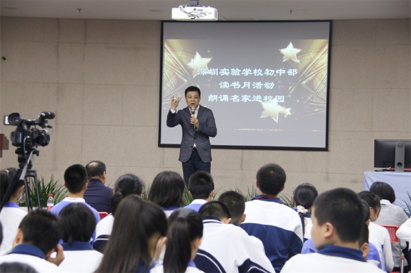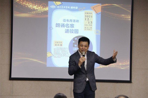 12月13日下午,深圳实验学校初中部在一楼多功能厅举行“读书月”朗诵讲座活动,邀请了深圳朗诵名家吴庆捷老师讲解朗诵技巧,全校师生通过现场和观看直播的方式参加了讲座活动。