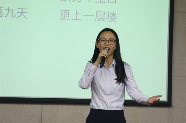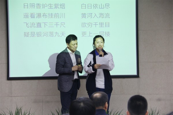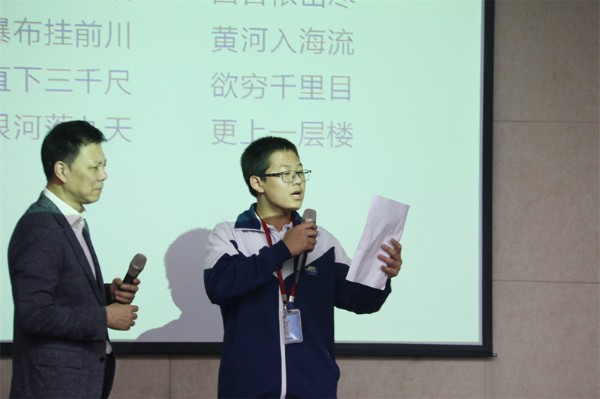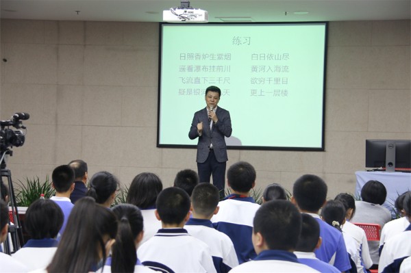 接着,吴老师向同学们分享了一些诵读古诗的方法,这个模块他以《登鹳雀楼》和《望庐山瀑布》两首诗展开,主要方法有读重音、重点字重读和拖长音,让朗诵更丰富、有情调等,他说的那种半实半虚,虚实结合的感觉,好似将人带入了诗人写诗时的山水美景中,身临其境,感同身受。吴老师还告诉同学们要朗诵好诗歌,了解诗人想要表达的情感和心境很重要,这样才能将情感带入到朗诵中去。许多同学纷纷上台跟着吴老师练习朗读,并将自己的情感代入到朗诵中,读得十分投入,真是活学活用,点石成金。