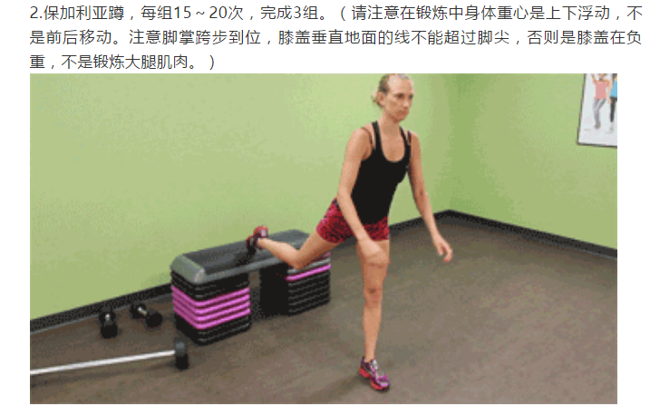 4.弓步屈膝抬腿,每组20个人,左右交替,完成3组。