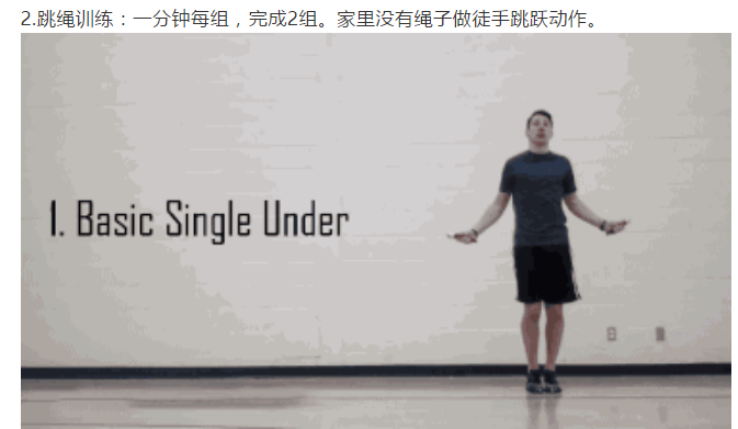 3.跳绳训练:每组一分钟,每组间歇2分钟,完成3组。