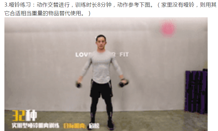 3.哑铃练习:动作交替进行,训练时长8分钟。