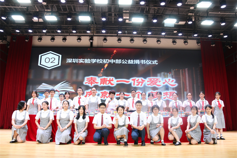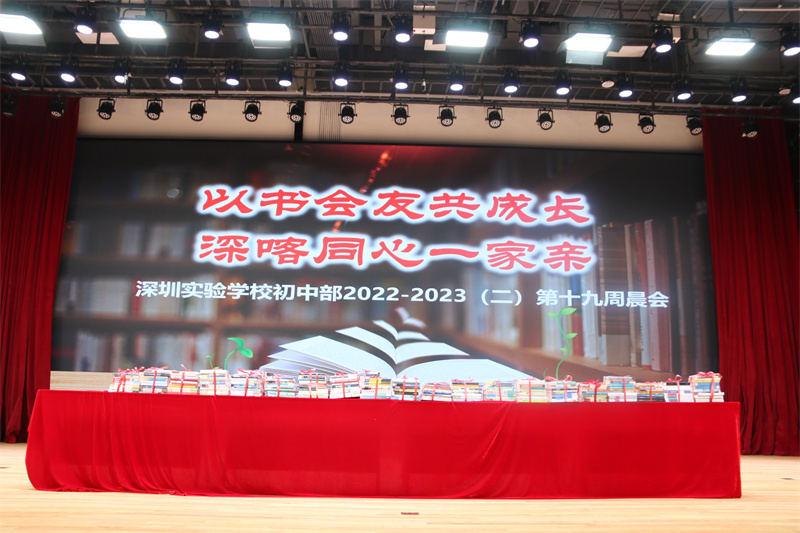 演讲结束后,举行了简朴隆重的捐书仪式。各班代表依次上台,将同学们的爱心书籍统一捐赠,随书赠送的还有同学们认真制作的书签等。同学们希望通过爱心捐赠让喀什同学在徜徉知识海洋的同时,随时随地感受来自深圳实验学校的暖心祝福。当一摞摞书本摆放在艳红的桌子上,深圳实验学校初中部与喀什实验学校的同学们在心中搭起了一座无形的桥梁,传递着深圳学生的热情与温暖。