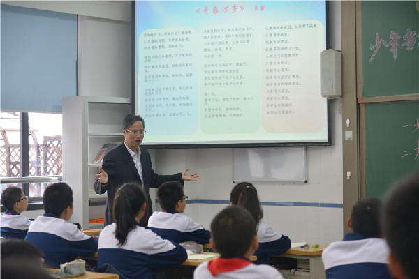 课堂中,衷校长情真意切地讲了一个童话故事《妈妈的心》,让同学们深刻感悟中国父母对子女最伟大、最无私的爱,懂得珍惜来之不易的幸福,不贪图安逸,不畏惧风雨,敢于吃苦,用自己的努力感恩父母,回报父母。衷校长让同学们静静聆听两代人朗诵的《青春万岁·序诗》(王蒙),并指导全班同学声情并茂地同声朗诵,一同感悟老一辈人“多沉重的担子我不会发软,多严峻的战斗我不会丢脸”“纵使陷身茫茫沙漠里,还有希望的绿洲存在……”的气概和豪迈,从长辈的青春故事中汲取前进的力量。春风化雨,润物无声,同学们在对诗歌的理解和欣赏中坚定了世界观、人生观和价值观。
