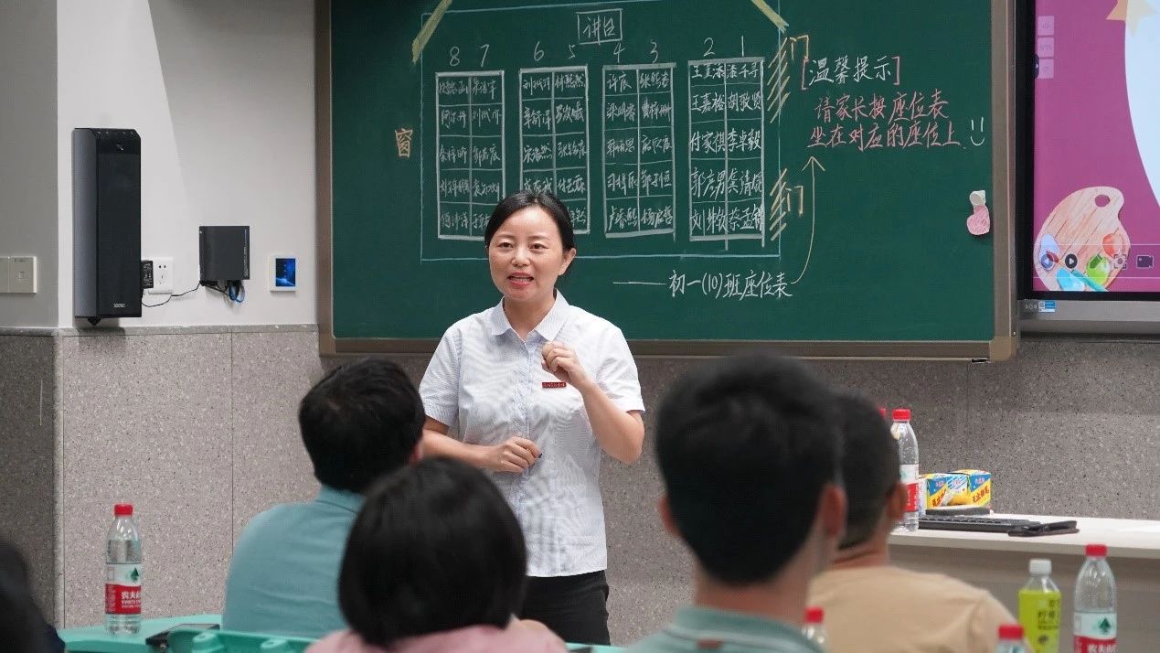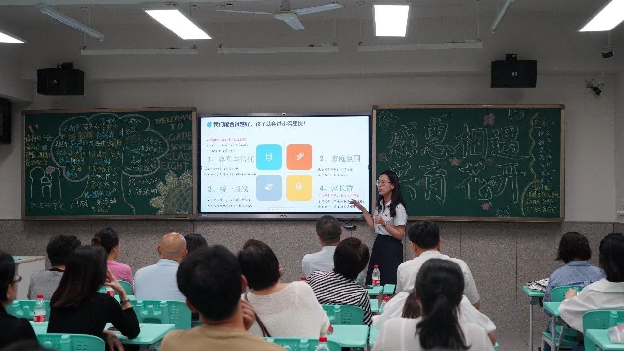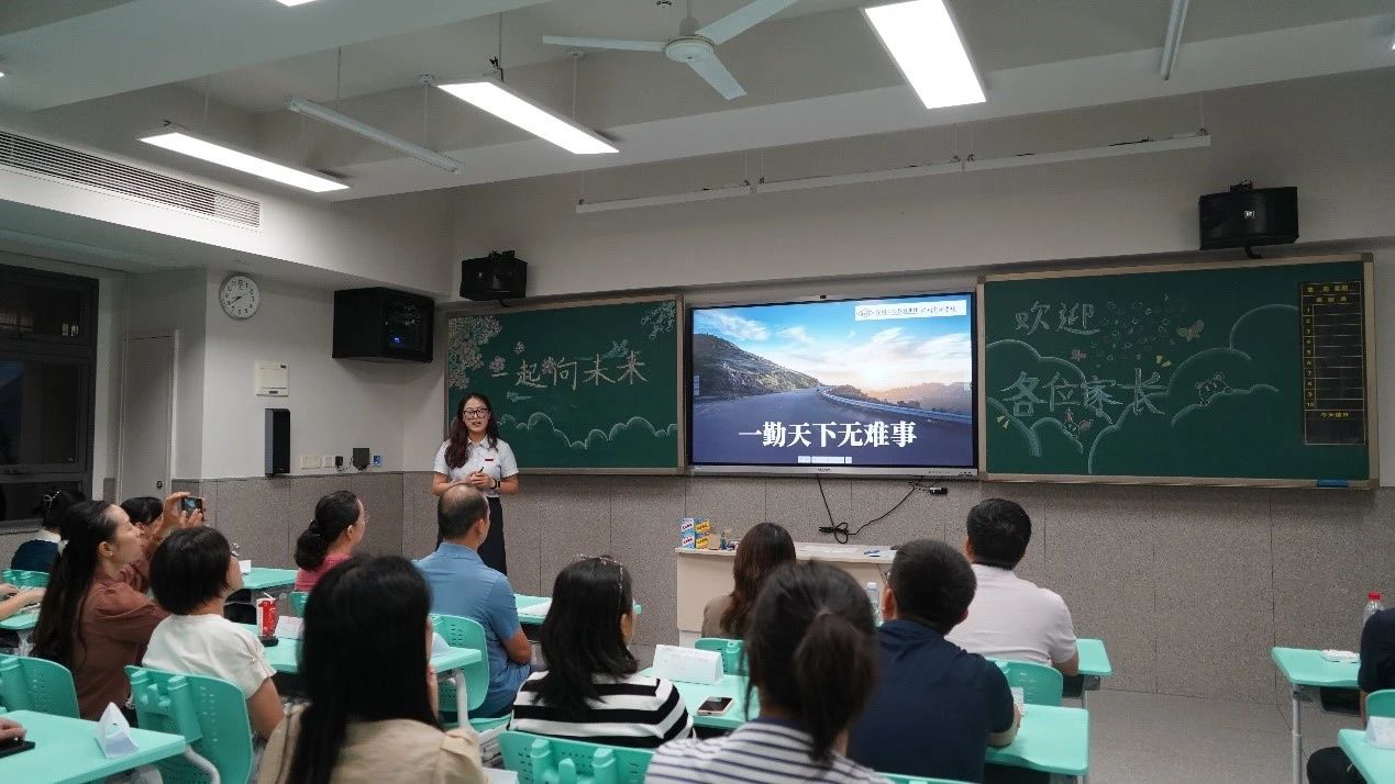教室里,科任老师总结孩子们开学一个多月以来的学习情况,介绍了各自的教学理念、教学成果,并表达了对孩子们的期待。