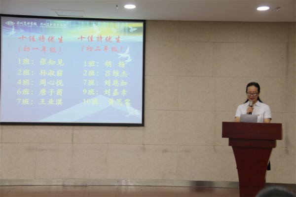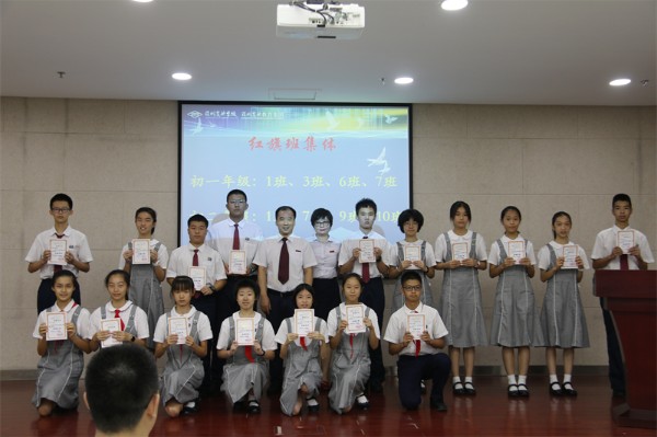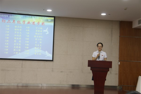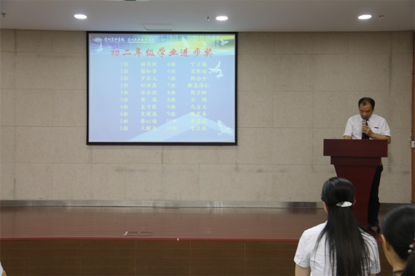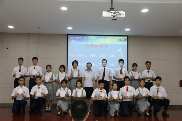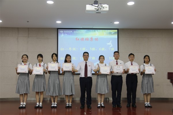接着,教务处王洪吉主任宣读了本学期教务处表彰决定及本学期获得“学业优秀奖”和“学业进步奖”的学生名单。王洪吉主任、胡晓江副主任先后为获奖学生代表颁奖。学生处张楠主任宣读了本学期学生处表彰决定,并宣布了三好学生、优秀学生干部和红旗班集体获奖名单。张楠主任和邰士剑副主任为获奖学生代表颁奖。最后,初中部邓旭执行校长为荣获红旗班集体的班级代表颁奖。