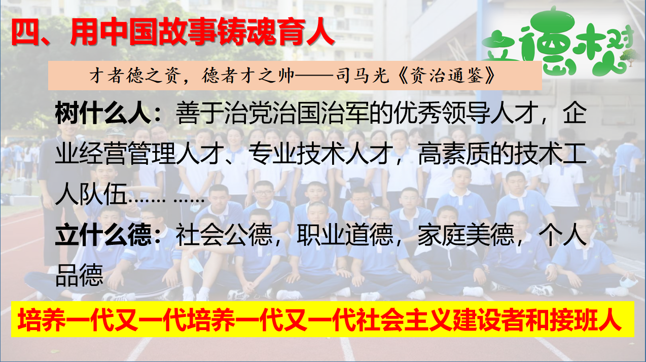 “摧伤虽多意愈厉,直与天地争春回。”在2020年疫情大考的这个特殊年份里,中国共产党带领全国人民交了一份满意的答卷。历经疫情磨砺,我们更加深刻地认识到中国共产党的领导和社会主义制度的显著优势。宏伟荡气的中国故事时时让我们梦想激昂、初心不忘。在全国教育大会上,习总书记以“六个下功夫”凝练概括出社会主义建设者和接班人应具备的基本素质和精神状态,其中把“在坚定理想信念上下功夫”摆在了首要位置。把握历史之脉,顺应时代之潮,响应梦想之唤,在三尺讲台讲好“中国故事”,将“小课堂”同“社会大课堂”相结合,积极引导学生树立正确理想信念,促进学生健康成长,这不仅是思政课教师的教学职责,也是每一位任课教师应该坚守的初心和职业使命。会上,思政学科彭清老师作了题为《用中国故事铸魂育人》的主题发言。彭老师从在国际比较中讲中国故事,用国与民的关系讲中国故事,用国家成就讲中国故事三个方面深入浅出地阐述了思政教育如何承担讲好中国故事,引领学生扣好人生第一粒扣子的使命。