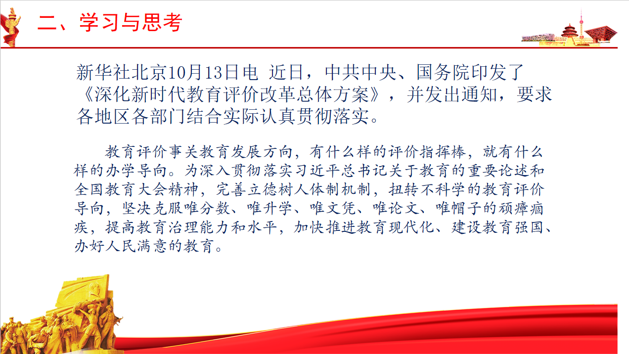“踏平坎坷成大道,斗罢艰险又出发。”2021年是中国共产党百年华诞,是“十四五规划”开启全面建设社会主义现代化国家新征程的第一年。为了以实际行动向中国共产党成立100周年献礼,邓旭副校长以“不忘立德树人初心,守记为国育才使命”为主题作了党建工作汇报,强调了下一步初中部将全面推进“党建+教育教学”工作模式,加强党的全面领导、全面覆盖和全面融合,努力把骨干教师发展为党员,把党员培养为骨干教师,充分发挥党组织的战斗堡垒作用和党员的先锋模范作用。邓校长带领大家学习了关于“教育评价改革”“教育惩戒”等相关新文件精神,引领全体教师深入思考如何树立科学的教育发展观、人才成长观、选人用人观;如何理解教育惩戒是为教育服务、是教育的一部分这一根本精神;如何理解教师是课堂教学的关键变量,如何更好地提高课堂效率,向课堂要质量;如何有效地布置批改作业,减负增效;如何有效地帮扶特殊情况学生等问题。团队攻坚,人才培养,质量提升,初中部的未来任重道远,邓校长寄语全体教职工在新的一年里永葆初心、牢记使命,乘风破浪、扬帆远航,继续奋斗、勇往直前,创造更加辉煌的业绩!