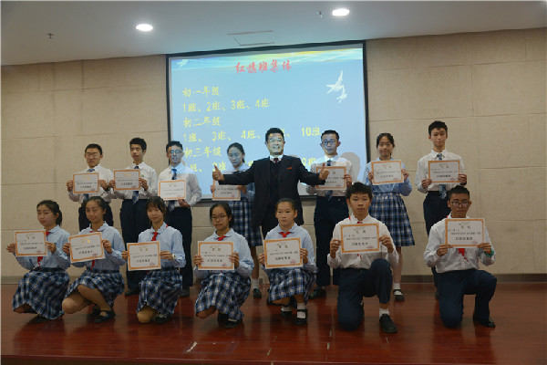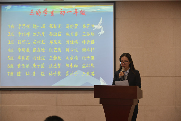 典礼在雄伟庄严的国歌声中拉开了帷幕。紧接着,跟随摄像机的镜头,全体师生观看了由初中部电教室精心制作的专题片,回顾本学期各项活动的精彩瞬间。开学伊始,初中部平稳顺利地从原址搬迁到百花六路六号;社会实践周,同学们严肃认真、坚韧顽强地完成了各项训练任务;体育节,开幕表演异彩纷呈、广受好评;运动会赛场上,每一位选手用拼搏和坚韧诠释了什么是体育精神;骨干教师示范课、青年教师赛课、主题观摩班会课,初中部师生的智慧和风采尽展无遗……每一帧画面都唤起了全体师生的美好回忆。精彩纷呈的活动见证了初中部学子本学期成长的点点滴滴。