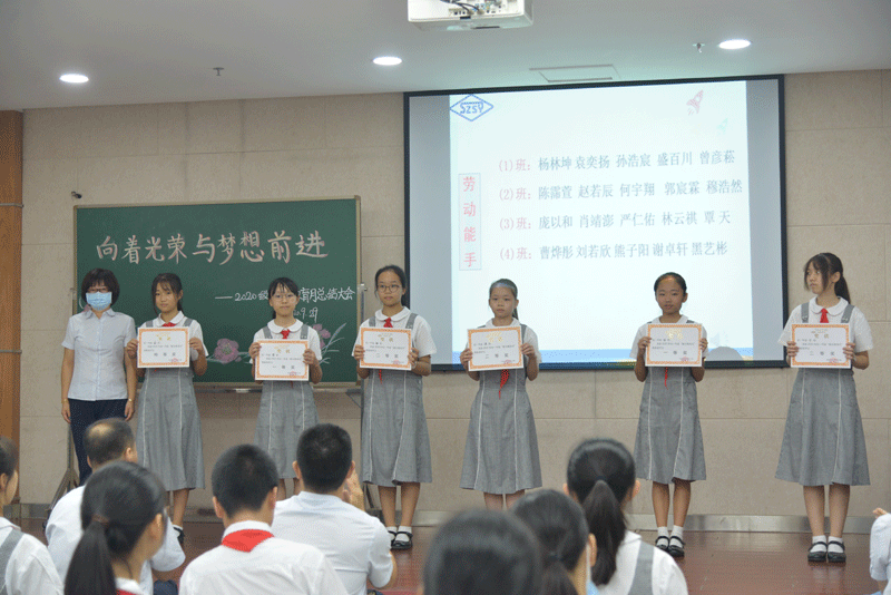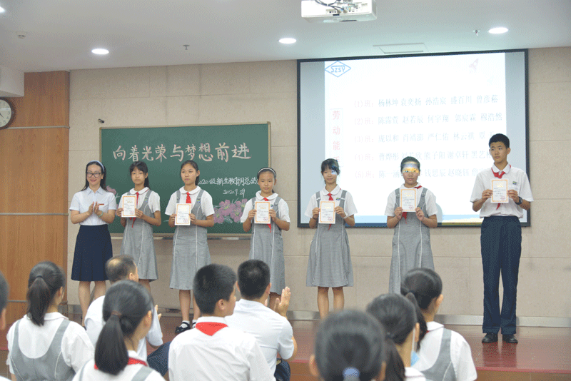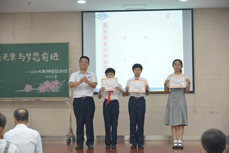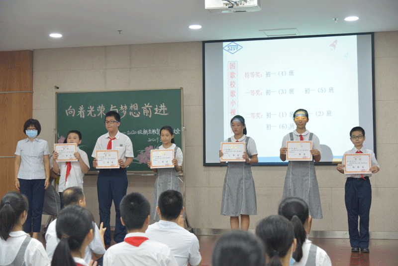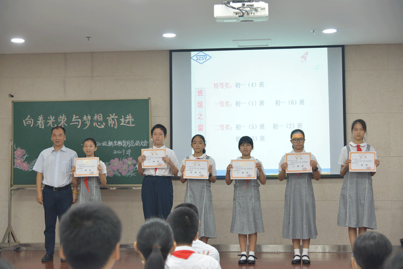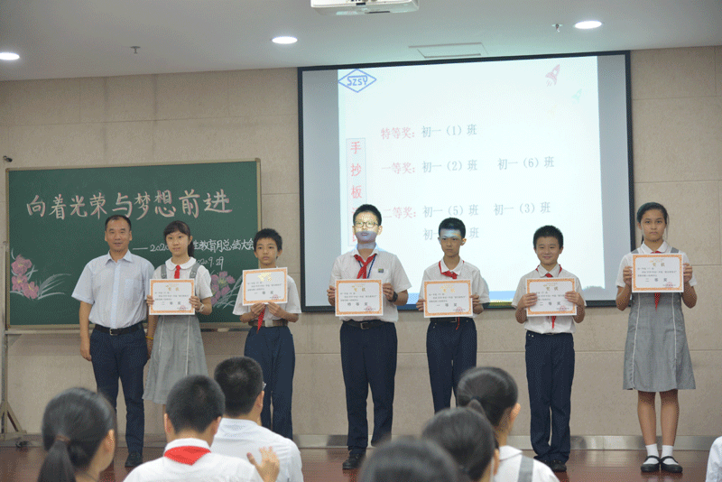 在这一个月里学校活动精彩纷呈,有黑板报比赛,文明礼仪手抄报制作,国歌、校歌小视频评比,班级之窗评比和每两周一次的流动红旗评比等等。在各项活动中有一大批同学表现出积极进取的精神风貌,时刻牢记为校、为班争光,对学习和班级工作充满使命感和责任感。为了表彰优秀,徐枫主任宣读了《深圳实验学校初中部初一年级新生教育月表彰决定》,对表现突出的班级和个人进行了表彰,学校领导分别为他们颁奖。