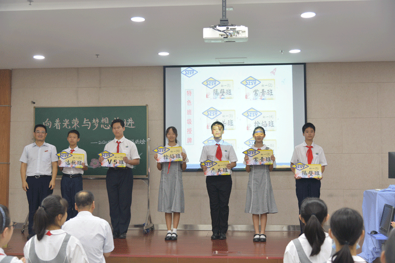 大会还举行了一项令所有同学十分期待的班级授牌仪式。各班根据同学们对本班班级文化的追求,制定了班歌、班徽、班名、班级口号等班级标志,六个班的班名各有特色:隔壁班、常青班、严关班、拾焰班、V5班以及远航班。在各班热烈的掌声中,邓旭校长为六个班级授予了精心制作的班牌。这块班牌凝聚了各班同学和班主任的智慧,承载了同学们对自己班级的期待、对未来三年的美好向往以及愿意为此付出青春与热血的心愿。正如彭主任所说:“接受了这块班牌之后,班级就有了灵魂。一个班级有了灵魂,这个班级就真正诞生了,共同奋斗三年的目标就确立了。”