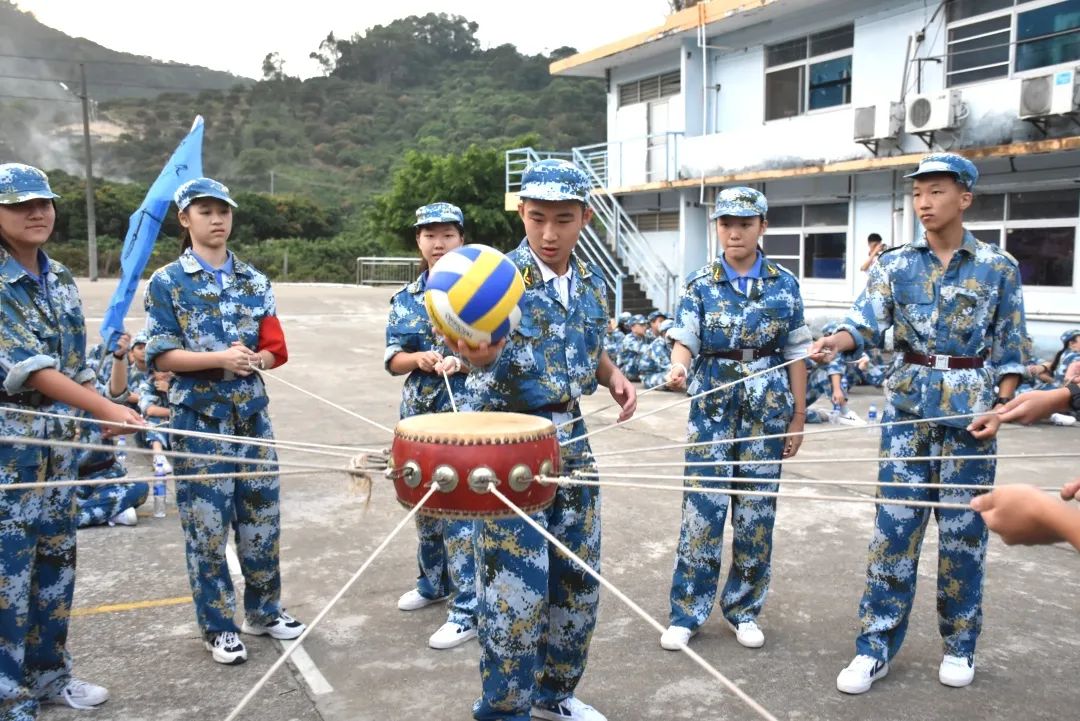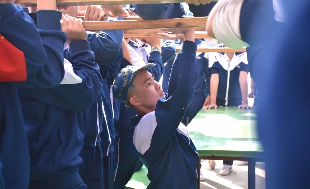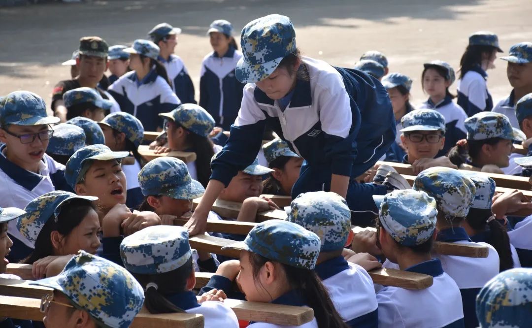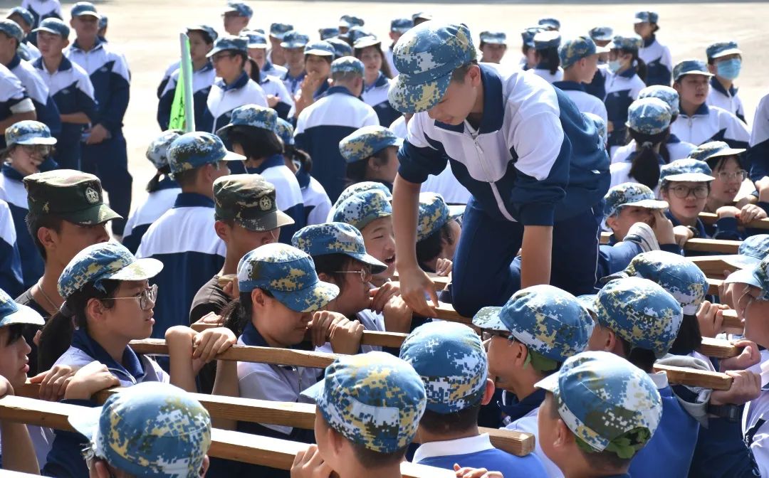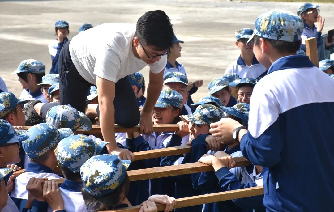 初二年级的同学们在基本的军事化训练以外还进行了让人受益匪浅的团建活动:“鼓舞飞扬”活动中,十几名同学取长补短,团结协作完成同一个目标。虽然一开始配合的很困难,但大家都不怕挫折,不断改进,在指挥员的带领下完成了任务;“生命动力圈”把全体初二同学的心聚在一起,同学们坐成三个圈,随着一声声坚定的口令摇着绳子,队长们在内圈挥旗奔跑,一边跑还不忘为同学们加油鼓劲,一圈、两圈、三圈......终于摇完了2020圈。同学们躺在地上,望着蓝天,仿佛空气都弥漫着一丝香甜,每个人都握住自己身边人的手,感受他人的付出,或许你的同学坐在圈的对面,但心却被那根麻绳给连在了一起;让人记忆最深的就是团队浮桥,全班被分成两路纵队,面对面站好,每两个人用同侧的肩膀撑起一块木板,啦啦队长站在最前面的桌子上带领大家呐喊助威,有两名同学成为“肉垫”在木板下保护同学,让每一位同学都能安全顺利地爬过木板浮桥。当教官宣布第一名同学开始爬时,每个人都坚定地点了点头,握紧了肩上的木板,随着啦啦队长的高呼加油,渐渐地,大家的嗓子都哑了,不停地靠吃润喉糖保护嗓子。每次的加油声不仅是给那些正在爬的同学,也是在给支撑的同学力量。最后,同学们都邀请班主任老师和教官一起爬浮桥,每当他们爬过一块木板,大家就用发自肺腑的力量高喊:“老师加油!教官加油!”那一刻,稚嫩的肩膀撑起了一个成年人的重量;舞蹈《你笑起来真好看》让初二同学重新体会了微笑的力量,音乐响起,大家都笑了起来。在艰苦的军训生活中,笑容让人身心愉悦放松。