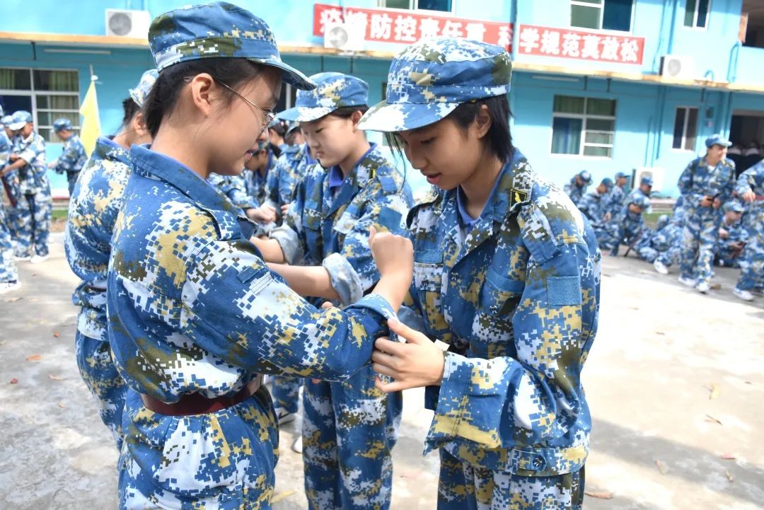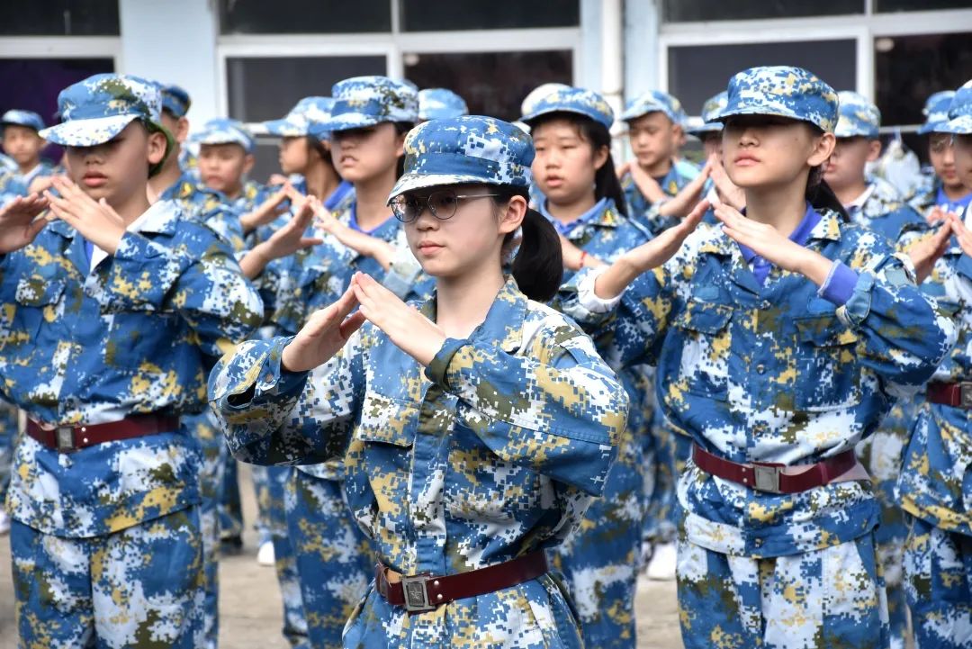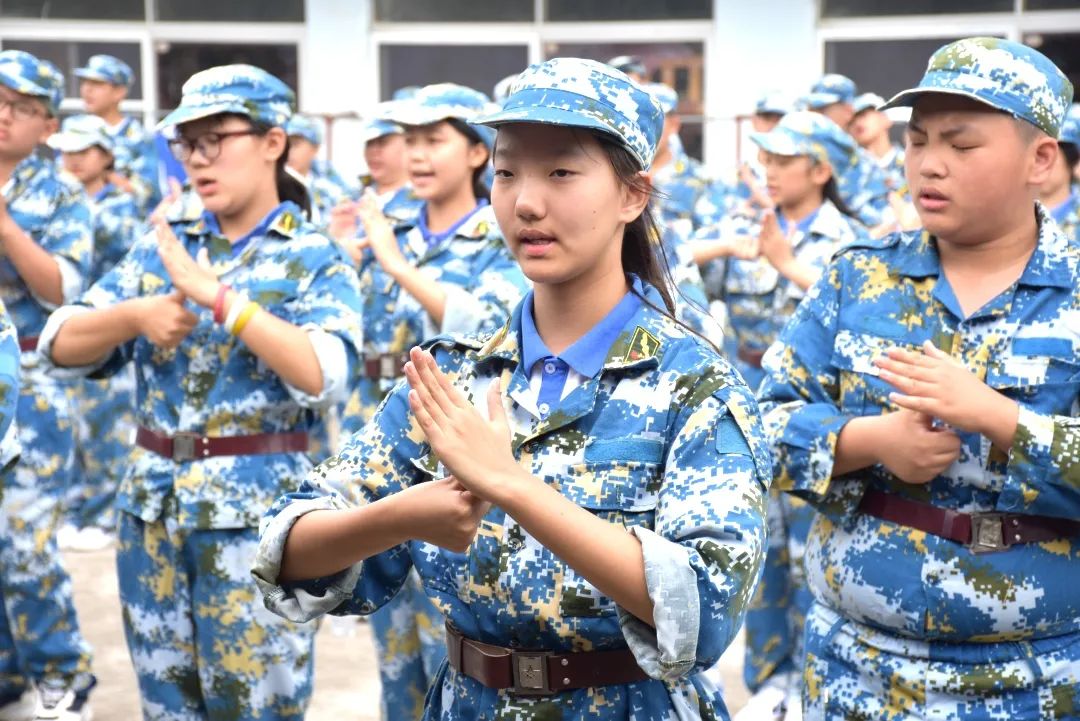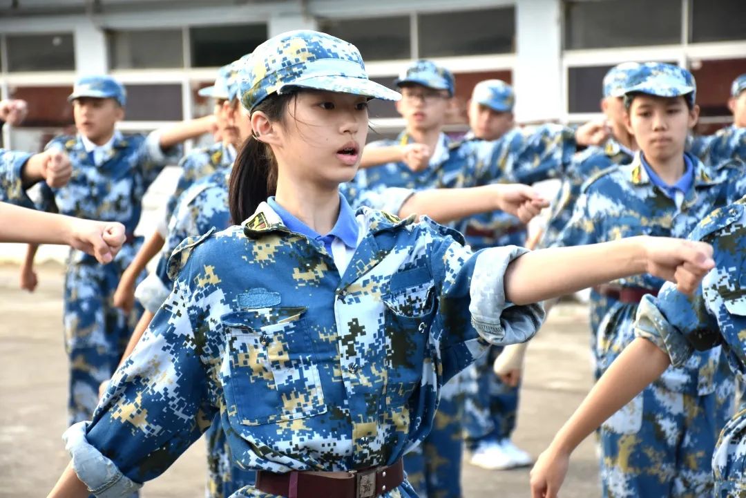 同学们来到军训基地后的第一件事就是迅速换上军训服,参加基地举办的开营仪式。接着,就马不停蹄的开始了最基本的训练:立正、稍息、齐步走、停止间转法。一个上午转眼就过去了,带着初到的兴奋与训练的疲惫,同学们来到了食堂。第一顿午餐是最让人期待的,同学们不抱怨、不吵闹,有秩序地享用基地自给的农家菜。然后又是一下午的训练。晚饭后,同学们排好队去洗澡、洗衣服,这是他们在家从未有过的体验,独立完成自己的内务,并整理好宿舍卫生。由于各连都有竞争积分制,所以大家都憋着一股劲,忍着身体上的酸痛,努力为了集体做到最好。全年级几天下来,没有一位同学选择退出,全部坚持到最后,真是让人欣喜。
