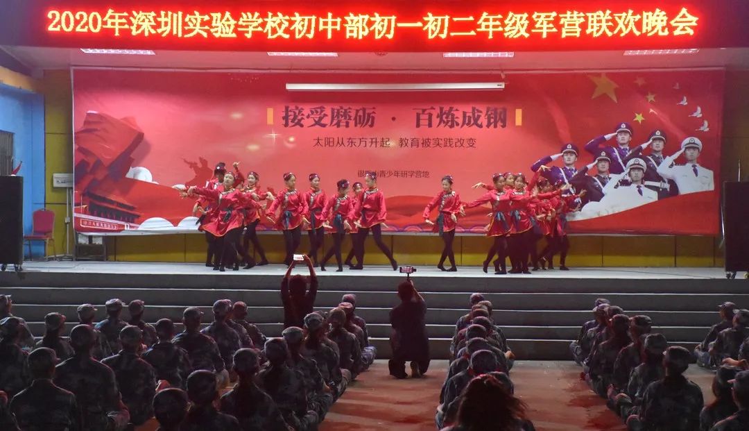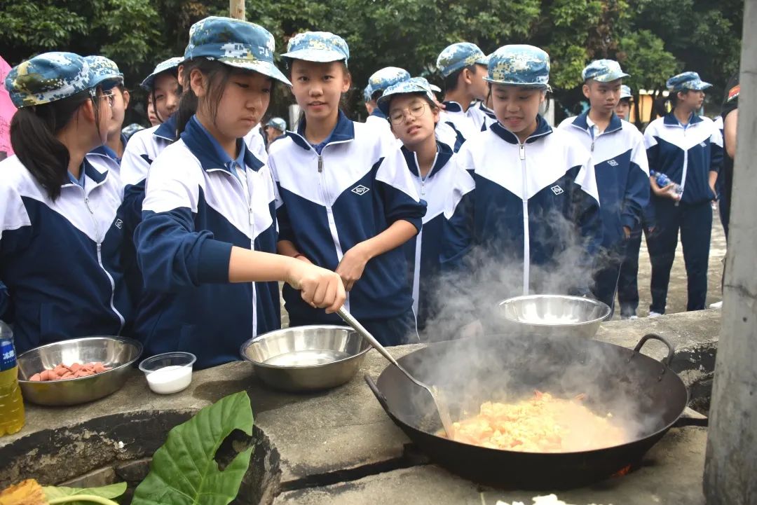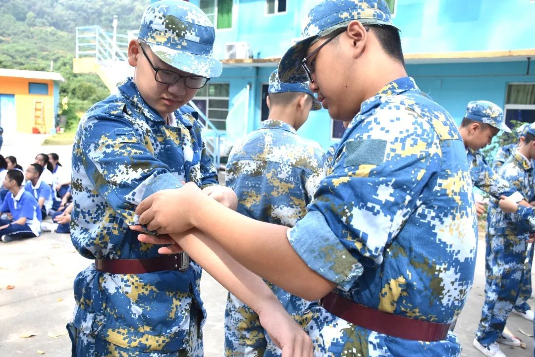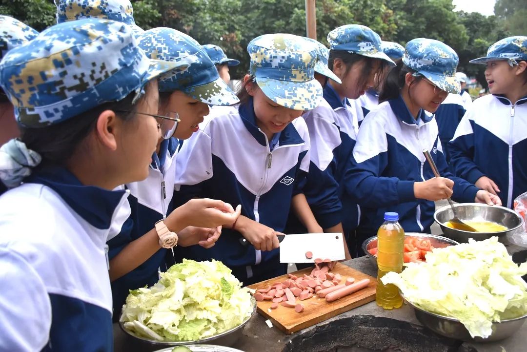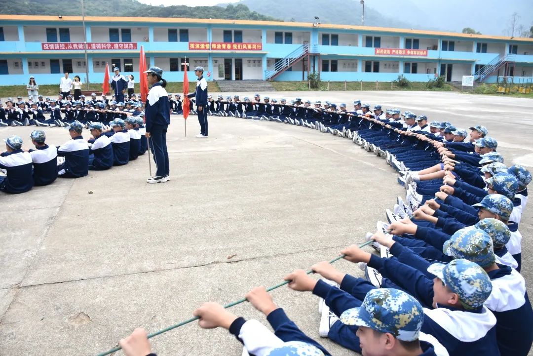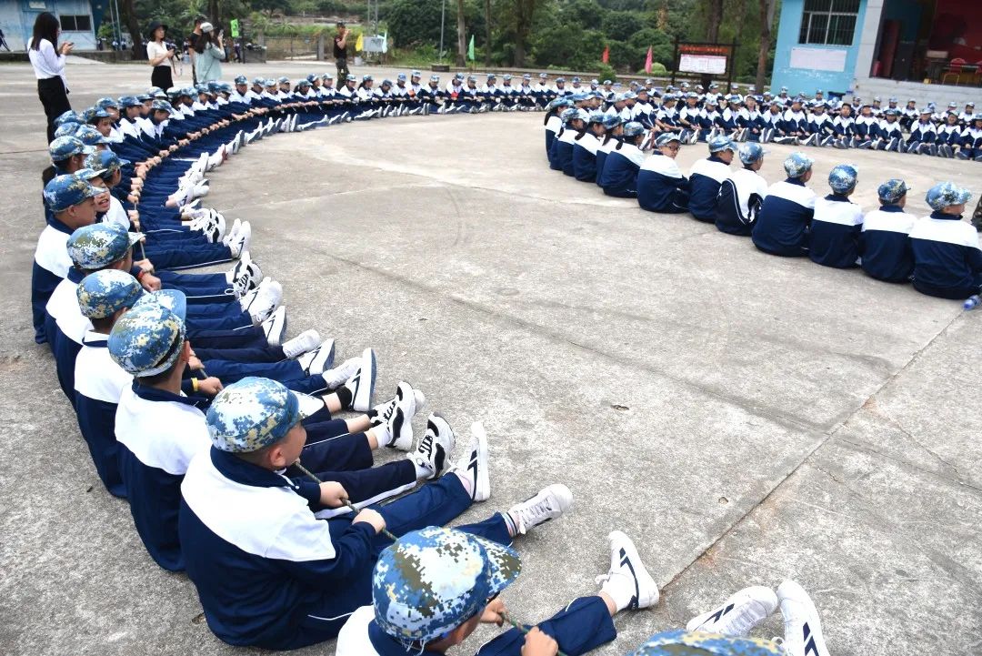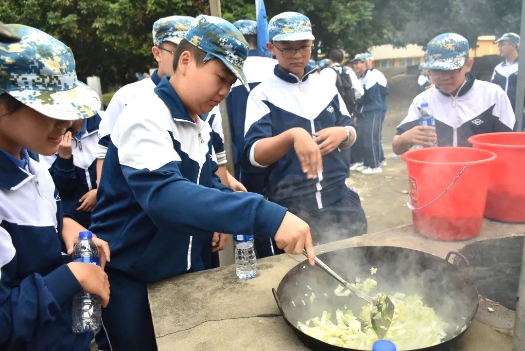 在军训期间,除了基本队列训练外,初一同学们的训练内容非常丰富:歌曲《国家》手语的学习,让爱国主义情感厚植在学生心中,无声中传递出深深的敬意与情感;集体跳绳强烈地激发了学生的竞争力和凝聚力;最振奋人心和扣人心弦的是“生命动力圈”集体项目,同学们拉起绳子围成两个圈,然后随着歌曲的节奏有规律的摇动手中的绳子,各连的队长则需要在两个圈中扛起队旗奔跑,摇绳的同学摇的速度决定着里面挥旗跑步的人跑的时长。这个项目考验的不仅仅是班级内部之间的合作,更是班组之间的合力,大家齐声高喊、振臂齐呼,总共摇了2020圈!在这样的氛围下,学生们的潜能和毅力都被激发到了最大,他们虽然勒红了手,但每个人脸上都洋溢着自豪和满足;包饺子也是让同学们印象深刻的活动,终于不再训练的他们犹如出笼的神兽,个个热情满满想要施展一番,同学们在活动中看到了不同的自己与彼此,让刚开学时的不熟悉变得亲密,让刚来基地的畏惧情绪变为团结友爱,收获了青春中最靓丽、最温馨的回忆。