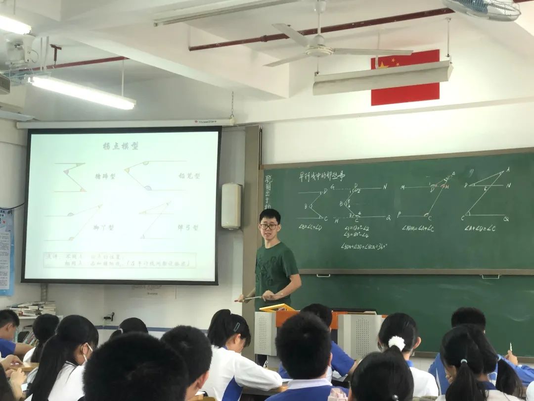 詹欣豪老师的“平行中的那些事”这堂课,以“一张纸”贯穿全课堂,设计了两个探究活动。探究一,在学生已有知识经验的基础上,设计系列问题串,通过动手操作,研究“折纸中的平行”,在强化学生对平行中常见判定方法的复习,让学生在做中思、在玩中学,旨在提高学生运用所学知识解决问题的能力,积累数学活动经验。探究二,利用“白纸+三角板”演化出的数学问题,研究“平行中的模型”,引导学生沿着探究问题的常见思路(观察→归纳→猜想→证明),提炼并总结出四个拐点模型,既揭示方法也渗透思想,发展空间观念,训练逻辑推理。最后,利用总结出的模型解决两道折纸问题,通过识别模型、迁移运用,让学生体验到从理论到实践的快乐,也感受到:数学问题虽变幻无穷,但数学思想帮助我们以静制动!