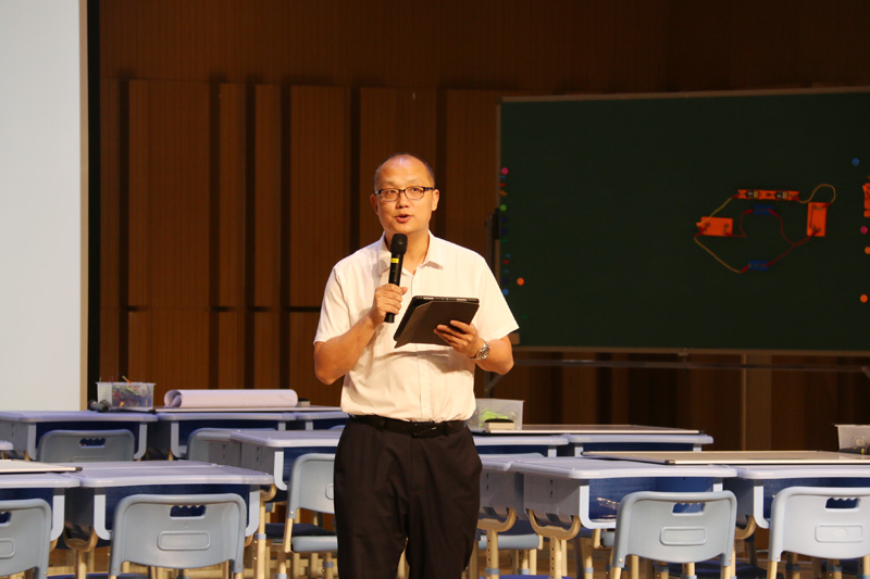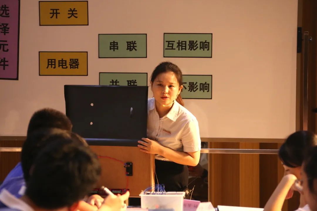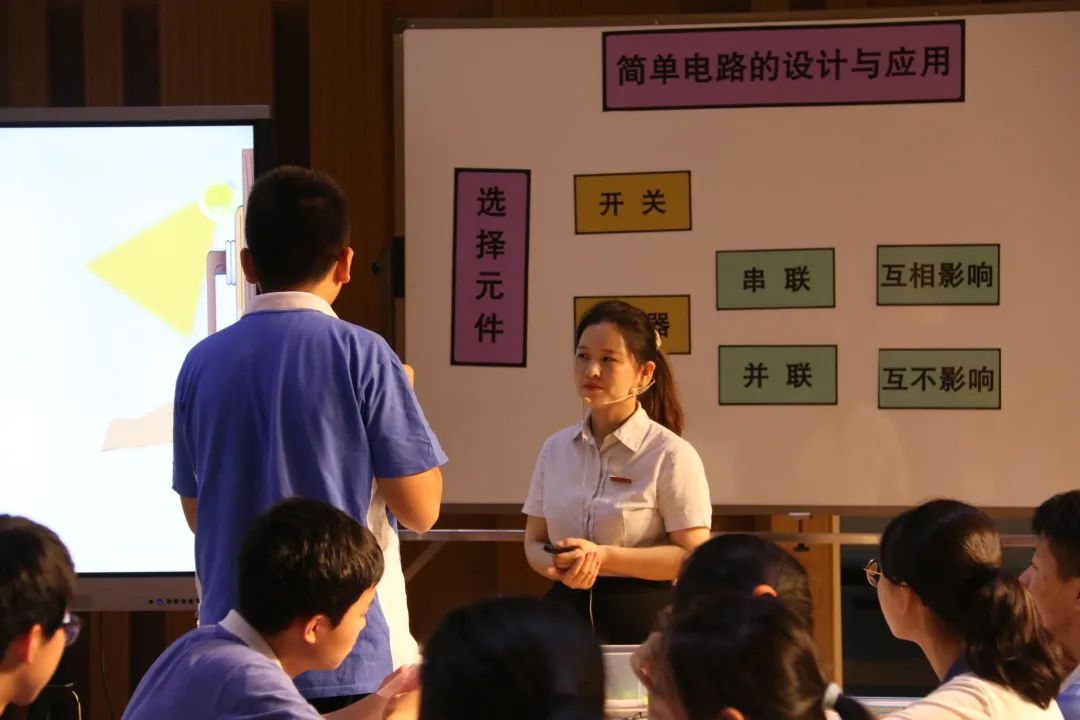 市物理教研员杨明老师高度赞扬陈蕊老师的课,说:“这节课是在传统复习课上的一次突破,课程以有趣的物理的浪漫之路视频导入,迅速抓住学生的眼球。自制的盲盒教具的运用巧妙地复习了串并联电路的特点,之后整节课以生活中的物理情景为主线索,如手机解锁、额温枪、人脸识别红外测温系统、卧室的灯等,着眼于解决生活中的电路问题,体现从生活走向物理,从物理走向社会的新课程理念。本节课学生始终处于积极的思考和探究活动中,小组合作充分发挥了学生主动探究的积极性,教学素材贴近生活,很好地达成了本节课的教学目标。”