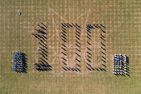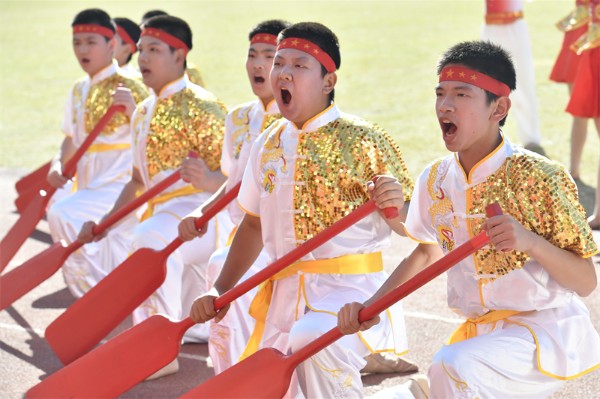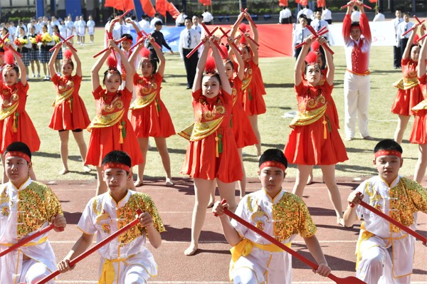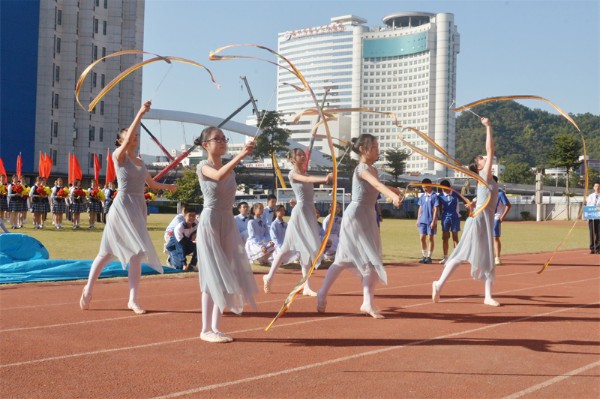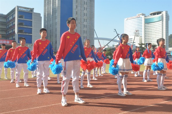 初一年级的五个班组带来了各具特色的方阵表演。初一(1)(2)班组的“赛龙夺锦”,朝气蓬勃、英姿勃发;初一(3)(4)班组的“魅力足球”,活力四射、青春飞扬。