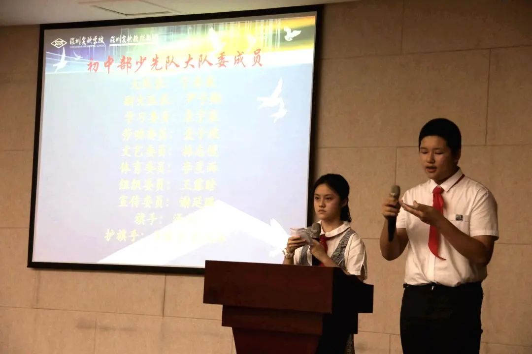 大会公布了中国少年先锋队深圳实验学校初中部大队委名单和初中部少工委名单。两份名单是经初一各班民主推选,初一年级党支部、初中部大队部、团委和党总支层层讨论产生的。