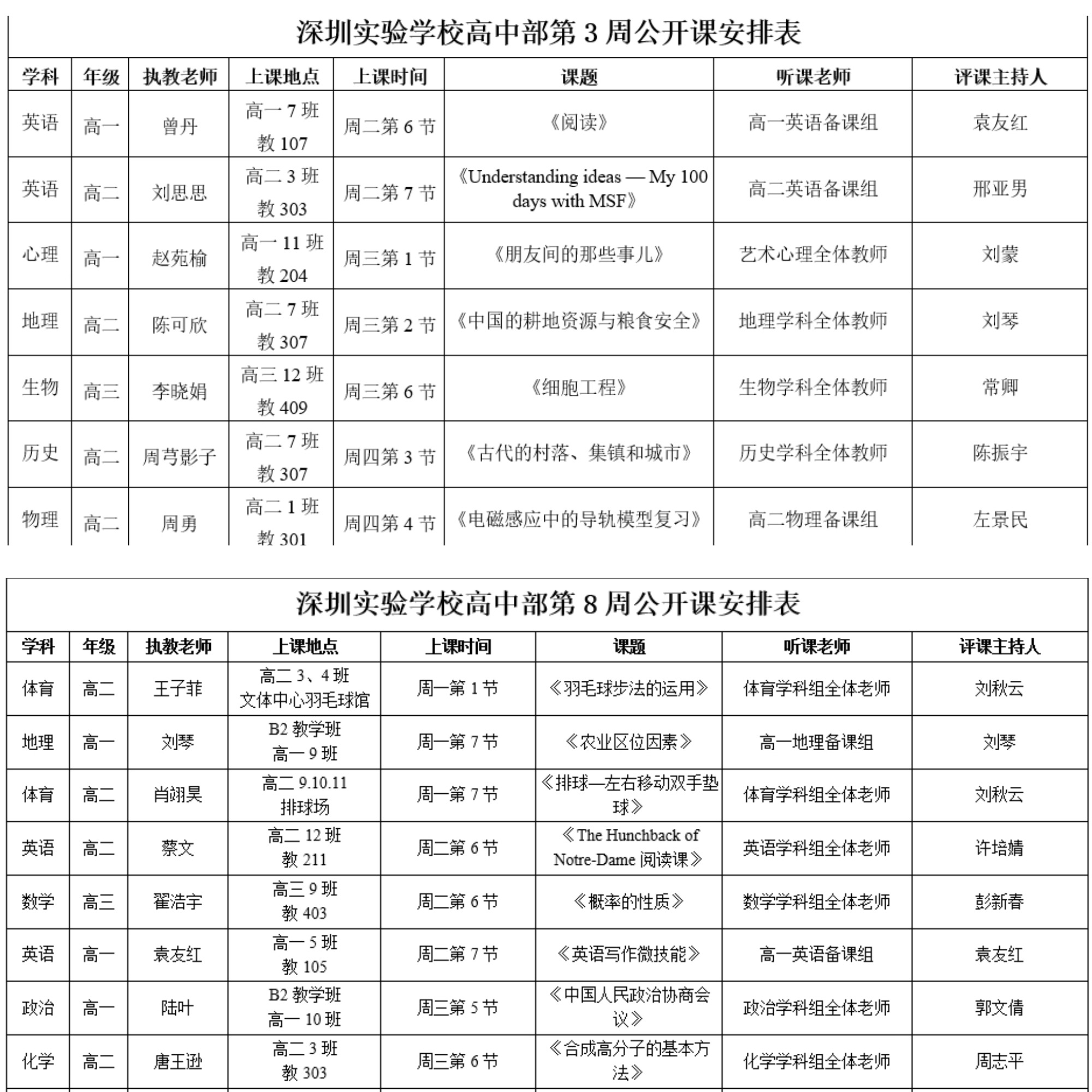 深圳实验学校高中部历来重视学科发展,以学科主任和备课组长为领导的教学团队建设扎实有效,各学科集体备课稳步推进。优化集体备课的思路、内容和形式,促进群体发展是学校一直在研究的课题。为了使全体教师能够在实践中成长,在交流中进步,从2023年下学期开始,高中部在三个年级各学科备课组内轮流推出了“人人公开课,一师一优课”的常态化公开课活动,各学科在集体备课当天的第六节课集中听课,第七节课进行评课和研讨。全校老师人人参与,精心准备,积极研讨,既发挥了资深教师的示范引领作用,也促进了青年教师的快速成长。