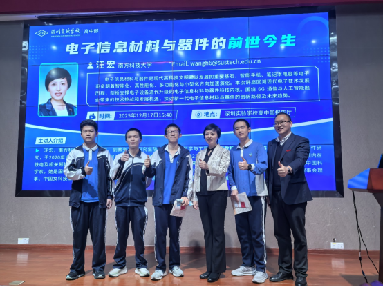 2025年12月17日下午,南方科技大学党委委员、副教务长、研究生院院长、材料科学与工程系讲席教授汪宏,走进深圳实验学校高中部报告厅,为高二年级学子带来了一场别开生面的电子科技启蒙讲座。作为全球材料科学领域顶尖专家、IEEE国际大奖获得者及青年女性科学家杰出代表,汪教授的到访受到同学们的热烈欢迎。
