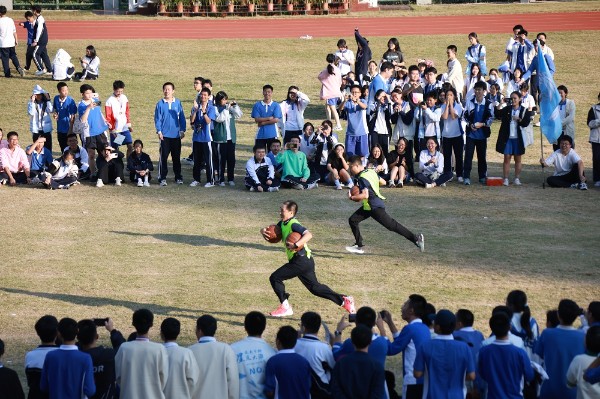 压轴出场的教职工比赛瞬间点燃了全校人的激情。只见在讲台上手执粉笔,严肃教学的老师们在绿茵场上竭力冲刺。人影散乱,笑声闹声混在一片,举起的相机争相记录珍贵的一刻,也记录着全实验最富有活力的一刻。
