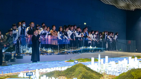 想要了解前海,最好从前海展示厅开始,因为前海展示厅见证前海的发展,伴随前海的成长。高中部团员们从主入口进入展示厅,通过全息投影的方式观看并聆听习近平总书记对前海发展的寄语。在沙盘展示区,团员们观看了气势磅礴的前海规划理念及未来城市风貌影片,沙盘与影片的解说词会同步配合亮灯,展示了前海的交通规划、前海水廊道及区域规划,生动地体现了前海作为国家战略区域的重要地位和发展潜力。