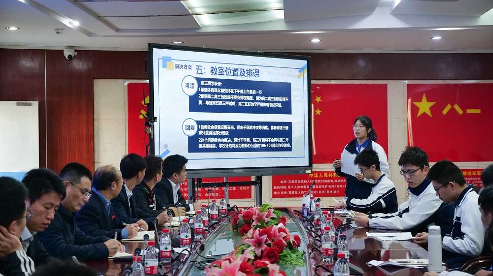2024年1月3日,邓旭校长协同各部门主任与各班班长齐聚309会议室,就同学们关心、关注的问题进行了探讨和交流。见面会伊始,学生会预选主席团的同学就将收集、整理的问题和建议以及前期采访各部门主任得到的回复和解决措施进行了ppt汇报。汇报的内容分为教学、食堂、宿舍和其他四个组别,每个组别的内容都是将前期从各班收集登记的问题与建议中整理汇总的具有代表性的问题,这些问题也得到了对应处室主任的积极回应,能够立刻解决的问题都进行了迅速的处理,一时难以解决或者因政策要求带来的不便也一一向在场的班长们进行沟通和解释。