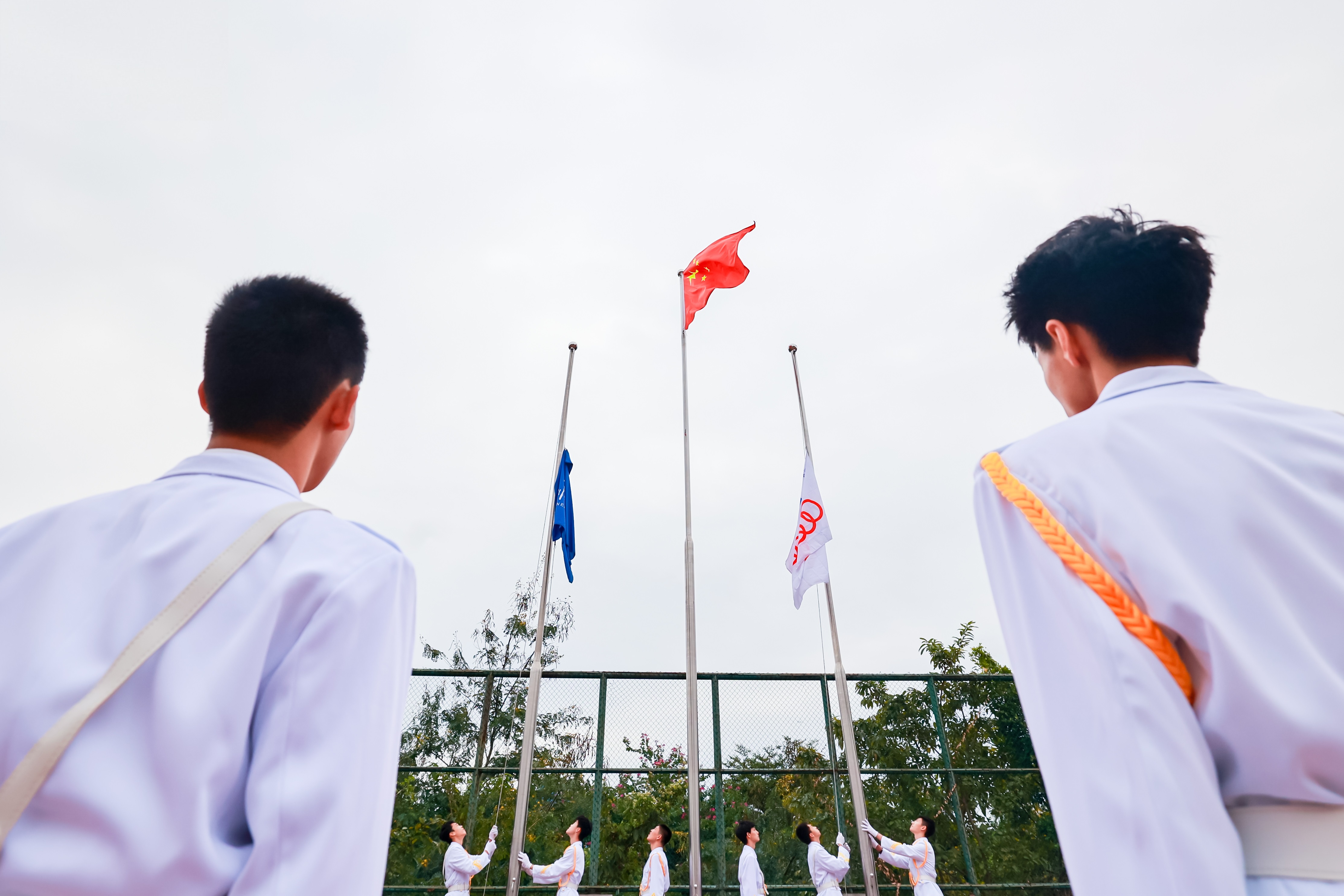 开幕式伊始,仪仗队率先入场,庄严地拉开了盛会的帷幕。国旗护卫队队员们目光坚毅,步伐铿锵,高擎着国旗、校旗与会旗,三面崇高的旗帜——鲜红、深蓝、洁白,三种神圣的色彩。它们迎风招展,彰显着实验人对学校、对体育精神、对国家的崇高敬意。