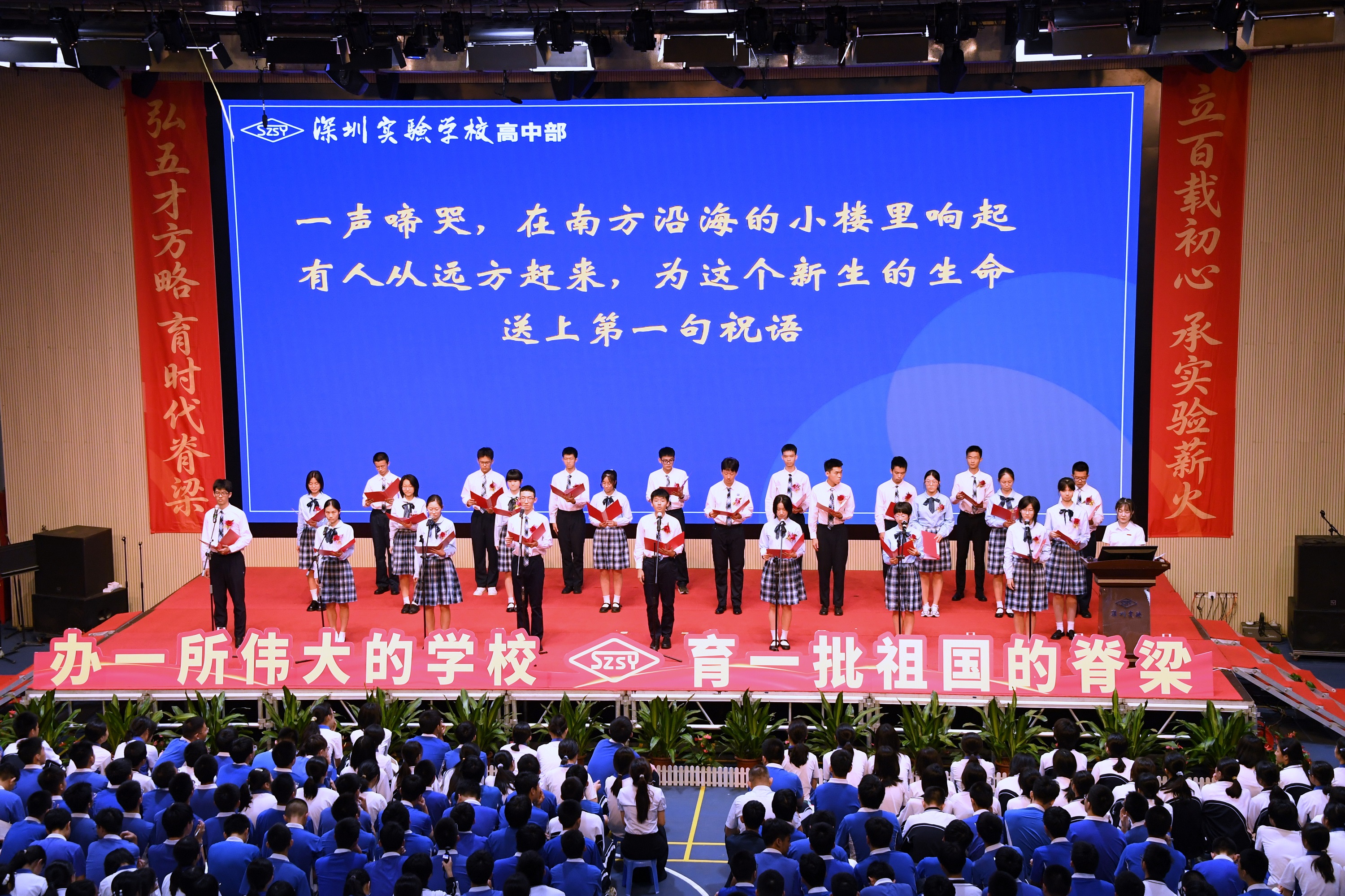 颁奖典礼的尾声,全体获奖学生为深圳实验学校献上诗歌——《那抹蓝,那束光》。他们将深情的目光投向实验的起点:从南方沿海小楼里的一声啼哭,到借来的课桌前蘸着晨露写下“实验”二字的第一代拓荒者;从华强北的霓虹到光明街巷的晨光,蓝白校服的身影走过特区四十一载春秋。他们轻诉成长的迷惘——折成纸飞机的心事、深夜里辗转的彷徨,也铭记那些被温柔托住的时刻:走廊里沙哑嗓音讲完的最后一道题、同桌递来的半块橡皮、夕阳下那句“慢慢来,没关系”。诗行流转间,领奖台上的荣光与平凡日子的微芒交相辉映,最终汇聚成一声坚定的回应:实验人,在这里;那抹蓝,那束光,无论走多远都落在眼底、映在心上,代代接棒,永向远方。朗诵声落,掌声如潮,久久不息。