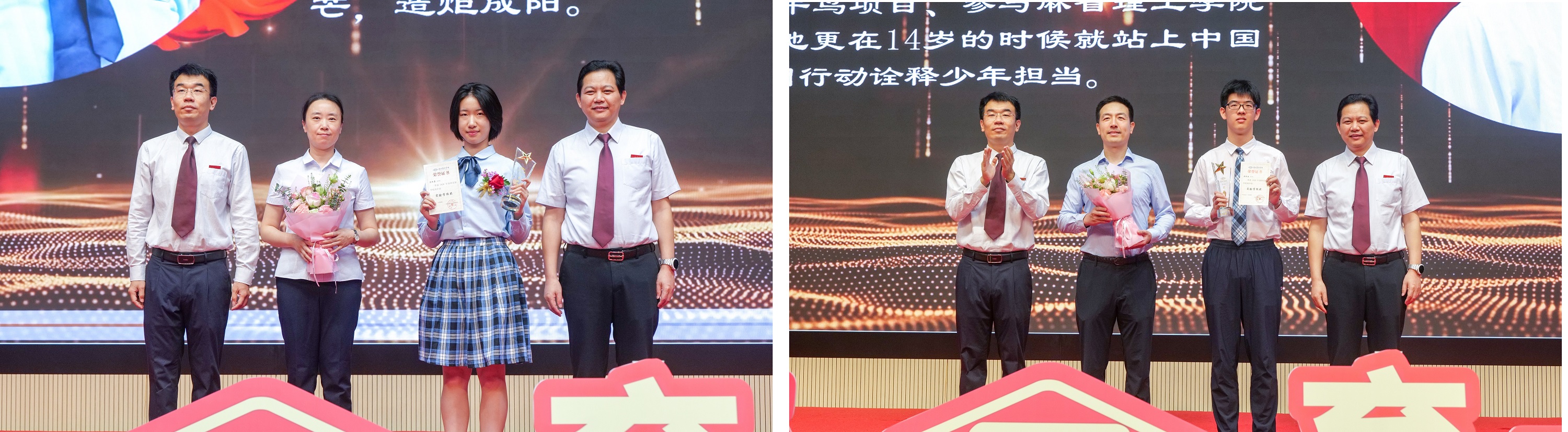在热烈的掌声中,获奖学子依次登台接受表彰。他们于学业中深耕不辍,在竞赛场上勇攀高峰,更在科技节与实验室里尽展创新锋芒;他们以摄影、音乐和运动的才情与活力点亮校园日常,用志愿服务传递温情与善意。在全面发展的成长轨迹中,他们正一步步淬炼为心怀家国、勇担时代使命的新青年。