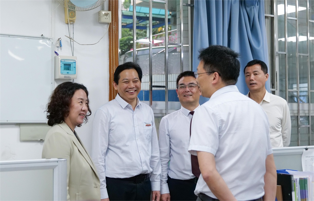 2024年4月8日下午,市委教育工委书记、市教育局党组书记、局长郑秀玉同志,市教育局党组成员、二级巡视员关苏同志,政策法规处姚平处长,发展规划与财务管理处黄雪坚处长等领导莅临深圳实验学校高中部调研指导。郑局长一行深入教学一线,参加法制副校长聘任仪式,走访校园场地,与师生亲切交流。深圳实验学校党委书记夏育华,党委副书记、副校长邓旭,集团部门主任、高中部处室干部全程陪同,系统介绍了高中部校园环境、基础设施和办学情况。