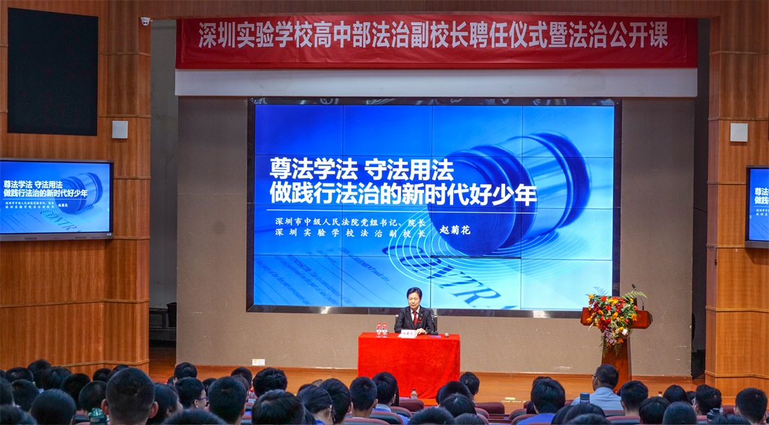 听课活动后,郑秀玉局长参加了深圳实验学校法制副校长聘任仪式,与高中部师生共同见证深圳市中级人民法院党组书记、院长赵菊花同志受聘担任学校法治副校长这一重要时刻。郑局长发表致辞,对赵菊花院长表示感谢和敬意,提出法治教育是立德树人的重要组成部分,是培养具有法治精神、法治素养的新时代接班人的基石。中小学法治副校长制度是贯彻落实习近平法治思想的重要举措,在加强中小学校依法治校、保护师生权益,推进青少年法治教育以及预防未成年人犯罪中发挥了重要作用。期望实验师生能够珍视这次难得的机遇,积极响应、主动参与,借助丰富的司法资源,不断推动法治教育深入校园,融入日常教学之中。随后,郑局长与实验师生共同聆听了赵菊花院长的公开课《尊法、学法、守法、用法,做践行法治的新时代好少年》。
