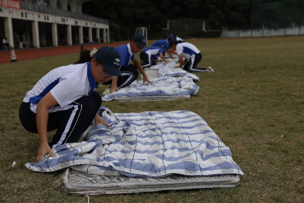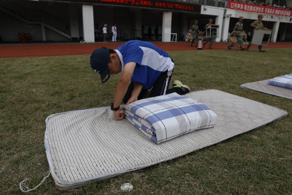 内务示范,风采尽展。十四名学员在教官的指挥下有序入场,放置被子,静待指令。烈日之下,他们犹如一尊尊沉静的雕像,纹丝不动。一声“开始”,全员俯身,动作迅捷,精准折叠每一寸被角。正面、反面,被子渐显四方,边角有棱。当第一个人起立并大声喊出“好”时,气氛瞬间高涨。男声和女声交织,你追我赶,自信、骄傲、昂扬。随着最后一名学员起身站立,十四床被子整齐排列,宛如猎猎旌旗,展现着少年人的自信与荣耀。
