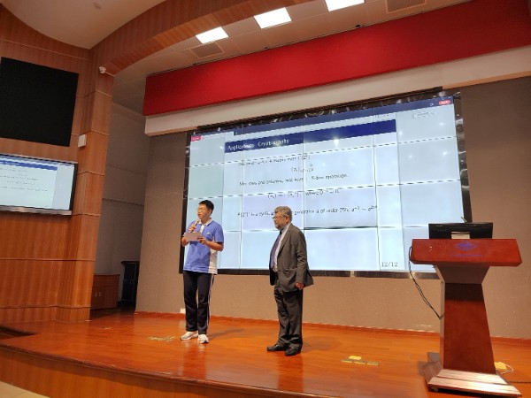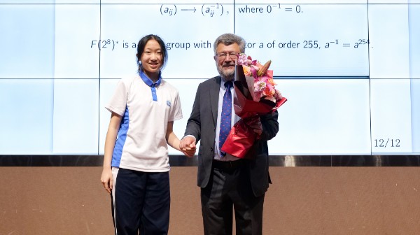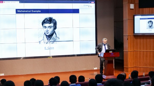 下午4点40分,杰曼诺夫教授步入会场,全体学生报以热烈掌声。杰曼诺夫教授从数学在技术革命中的重要性讲起,指出以数学学科为基础的信息革命将引领当今技术革新,数学将成为更加有力的工具。从法国著名数学家伽罗瓦的成长经历到德国数学王子高斯的故事,从有限域的发明到密码学的实际应用,杰曼诺夫教授幽默风趣,现场始终欢笑不断,氛围热烈而又自由。虽然对于大多数高中生来说,数学是一门比较有挑战的学科,但是教授的讲座深入浅出、举例生动,同学们一直聚精会神、用心领会。