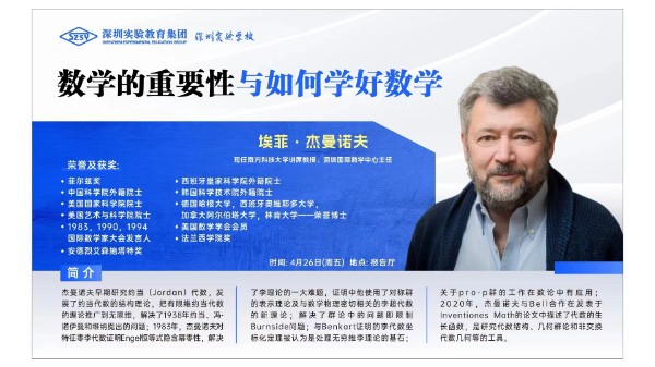 为促进拔尖创新人才的选拔与培养向基础教育阶段延伸,激发学生科学兴趣,鼓励学生树立科学梦想、拓宽文化视野、增强创新意识和创造力,我校于4月26日邀请菲尔兹奖获得者、中国科学院外籍院士、南方科技大学讲席教授埃菲·杰曼诺夫先生到深圳实验高中部做客,杰曼诺夫教授做了题为“数学的重要性与如何学好数学”的院士讲座。