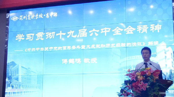 为认真学习贯彻党的十九届六中全会精神,教育引导全体师生坚定不移听党话、矢志不渝跟党走,11月26日,深圳实验学校高中部举行了《学习贯彻十九届六中全会精神》专题报告会,邀请深圳大学马克思主义学院院长傅鹤鸣教授进行《中共中央关于党的百年奋斗重大成就和历史经验的决议》解读专题讲座。讲座由办公室吴平波副主任主持,高中部全体党员、教职工和学生代表参加会议。
