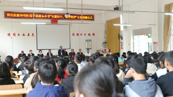 上午课间时间,深圳实验学校高中部赴连平陂头中学“与爱同行 捐书筑梦”公益捐赠仪式在学校礼堂隆重举行。陈平飞校长在讲话中对高中部师生“捐书筑梦”活动表示了诚挚的感谢,表示这些书籍将大大丰富陂头中学的图书资源,为同学们的学习打下良好的基础,也为两校师生的交流开启新的篇章。集团教育教学部李健副主任在讲话中介绍了高中部师生在党员、团员的带领下开展的捐书活动,勉励陂中的同学们坚持梦想,刻苦学习,用优异的成绩回报老师和家长。