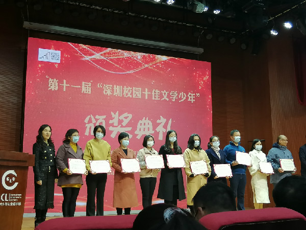 2020年12月30日,由深圳市教育局、深圳市文联、深圳特区报社、深圳读书月组委会办公室、深圳市阅读联合会主办的第十一届“深圳校园十佳文学少年”评比表彰大会在深圳市少儿图书馆隆重举行。深圳实验学校高中部刘湲桢同学获得“深圳校园十佳文学少年”称号;罗翊菲、温炜晗、陈昭宇、乔智健4位同学获评“深圳校园优秀文学少年”;焦锐男、吴平波、雷菱、樊北溟4位老师荣获“优秀辅导老师奖”,深圳实验学校高中部获评“优秀组织奖”。