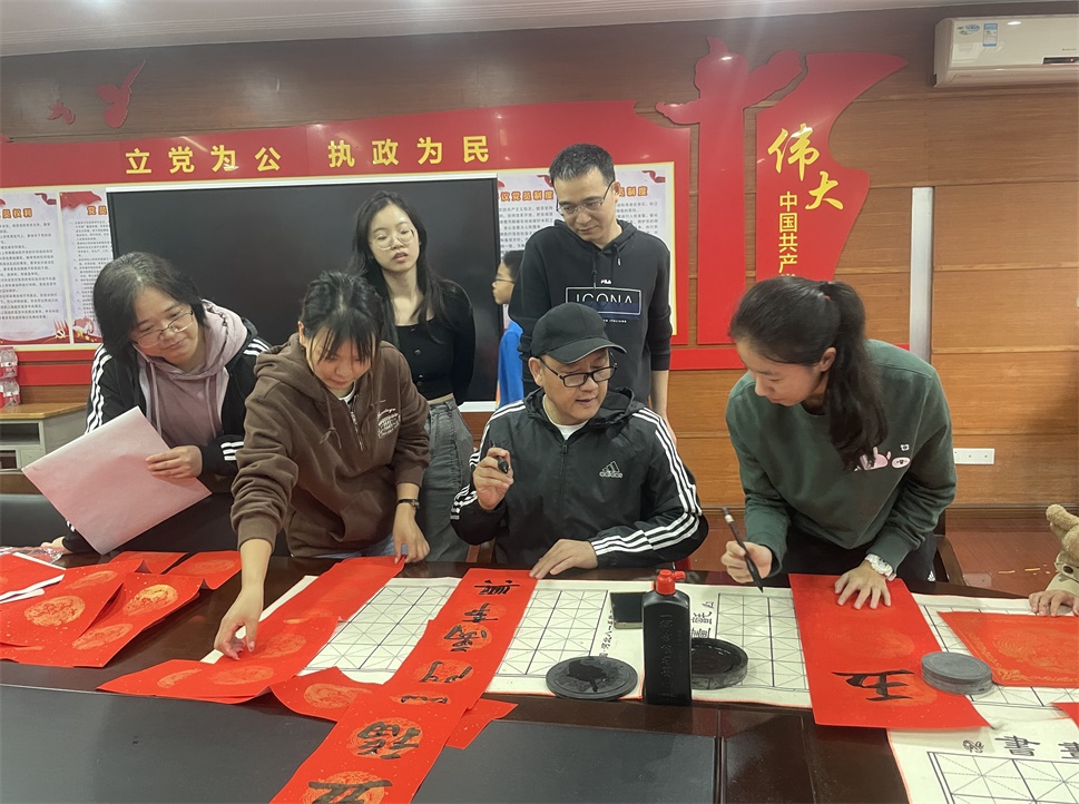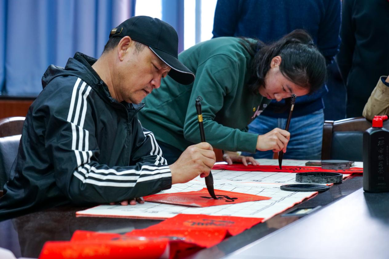 活动开始后,来自各个部门的教职工及其家属兴致勃勃地参与到春联创作中。他们在邓国安老师的指导下,或认真观摩,或点头称赞,或捉笔挥毫。一时间,整个活动现场充满了浓厚的学习和创作氛围。