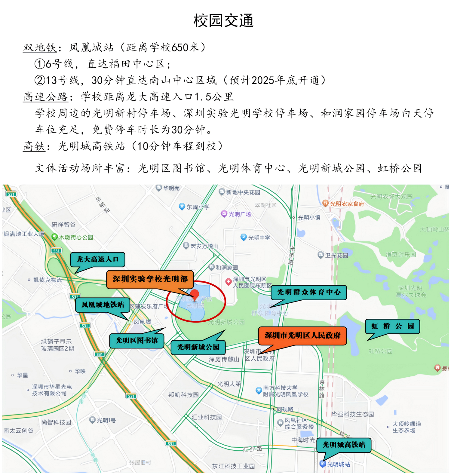 高 铁:光明城高铁站距离学校约10分钟车程,可实现高效跨区通勤。