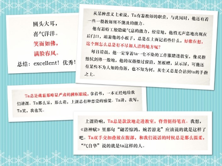 《记梁任公先生的一次演讲》是一篇写人记事的散文,为加深学生对人物形象塑造方法的理解和认识,杨老师提前让大家以微作文的形式描写了一位自己的老师,课上,当学生作品被投放在大屏幕上的时候,不仅台下的同学们都全神贯注地点评着文章中用到的描写方法,坐在教室后方听课的老师们也都饶有兴味地欣赏着同学们的文字。
